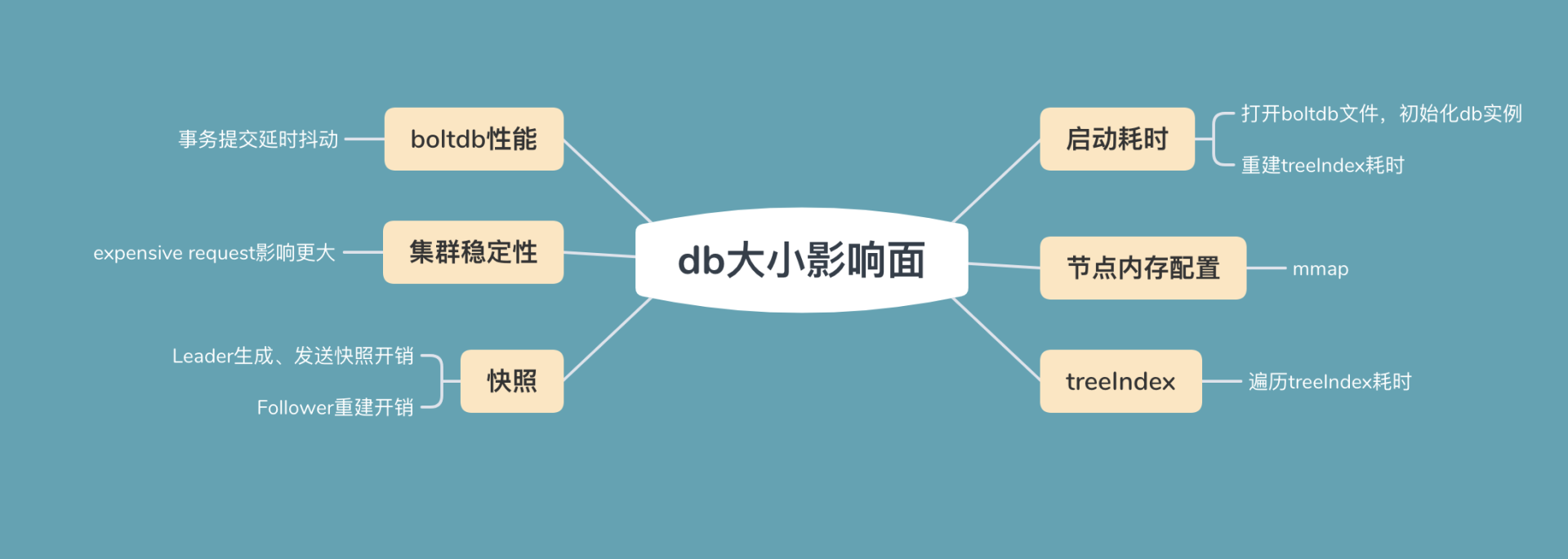 大db文件最后一个影响面是快照。它会影响db备份文件生成速度、Leader发送快照给Follower节点的资源开销、Follower节点通过快照重建恢复的速度。