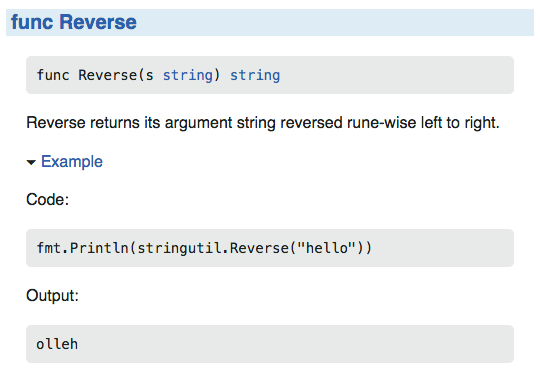 Godoc将在Reverse函数的文档旁边提供此示例,如下图所示: