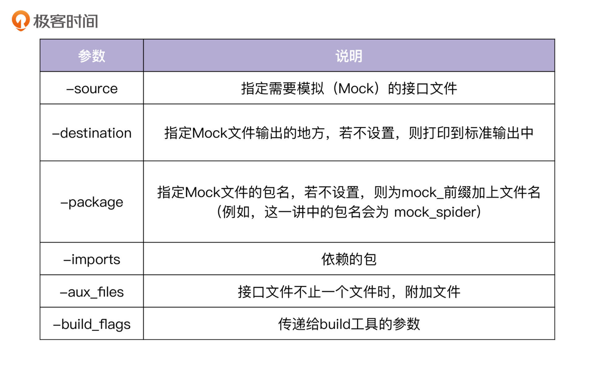 上面,我介绍了如何使用 GoMock 编写单元测试用例。其中,我们使用到了mockgen工具来生成 Mock代码,mockgen工具提供了很多有用的功能,这里我来详细介绍下。
