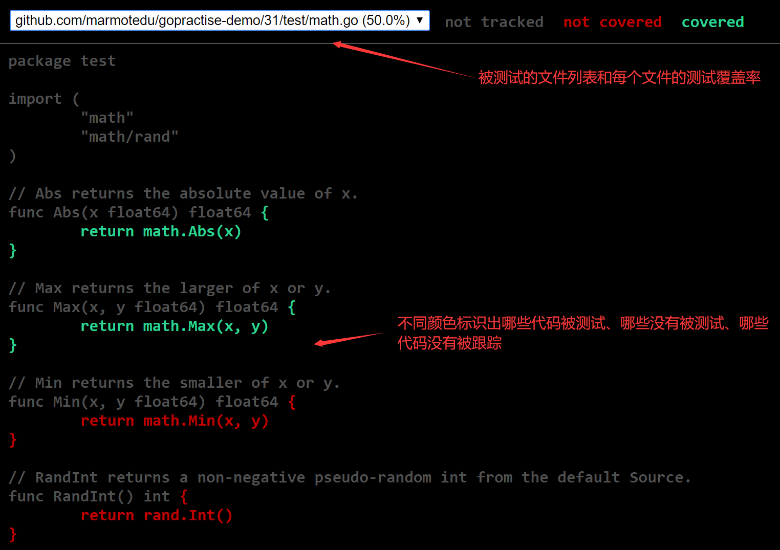 在上述命令的输出中,我们可以查看到哪些函数没有测试,哪些函数内部的分支没有测试完全。cover工具会根据被执行代码的行数与总行数的比例计算出覆盖率。可以看到,Abs和Max函数的测试覆盖率为100%,Min和RandInt的测试覆盖率为0。