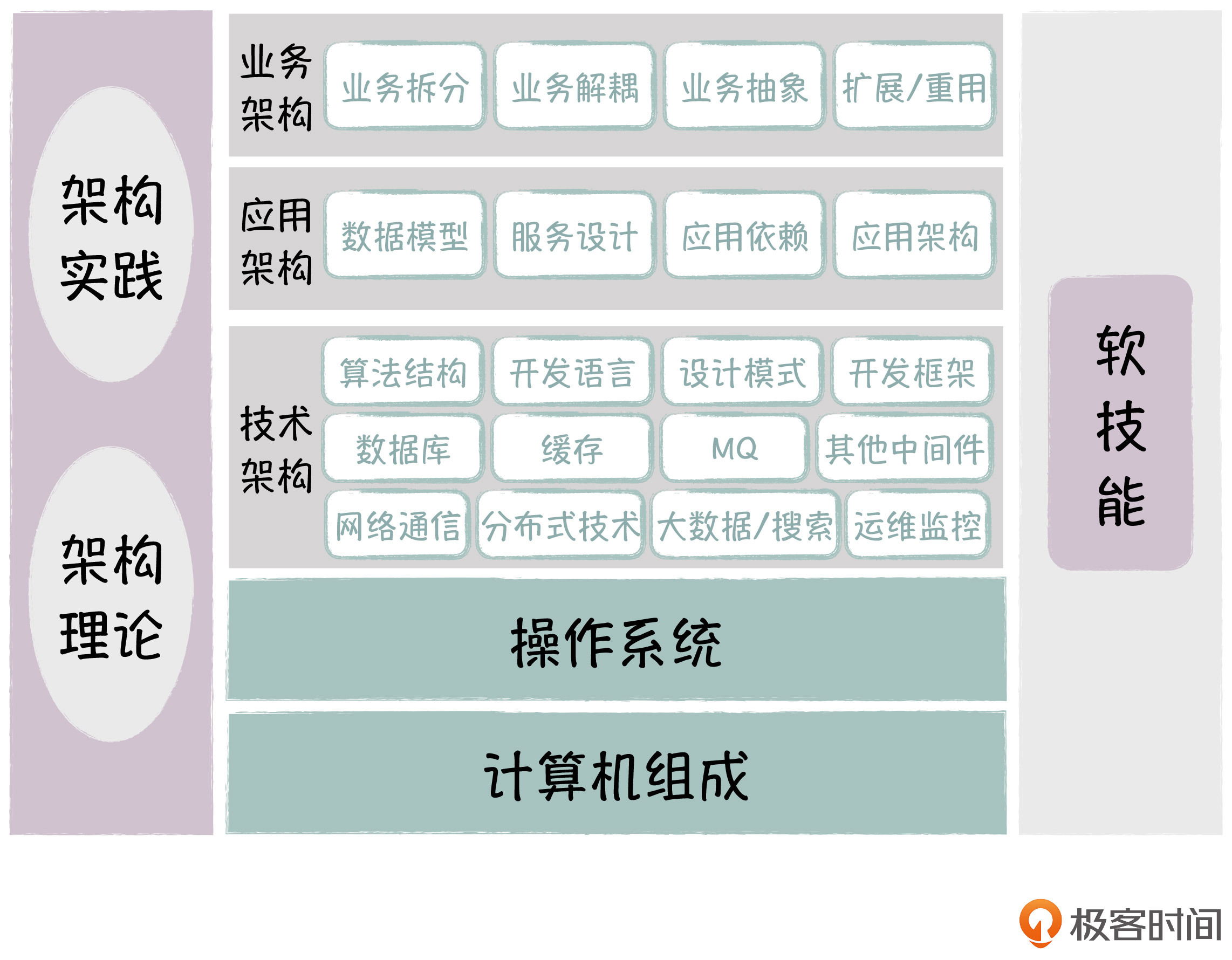 另外,在这个阶段,你也已经通过大量的实践,培养了很好的软技能,比如沟通能力、项目管理能力等等。那么最后,你就能做到技术和业务的融会贯通,可以平衡各种架构目标,设计非常实用和接地气的架构,并保障它的顺利落地。
