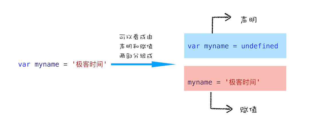 不过在介绍变量提升之前,我们先通过下面这段代码,来看看什么是JavaScript中的声明和赋值。