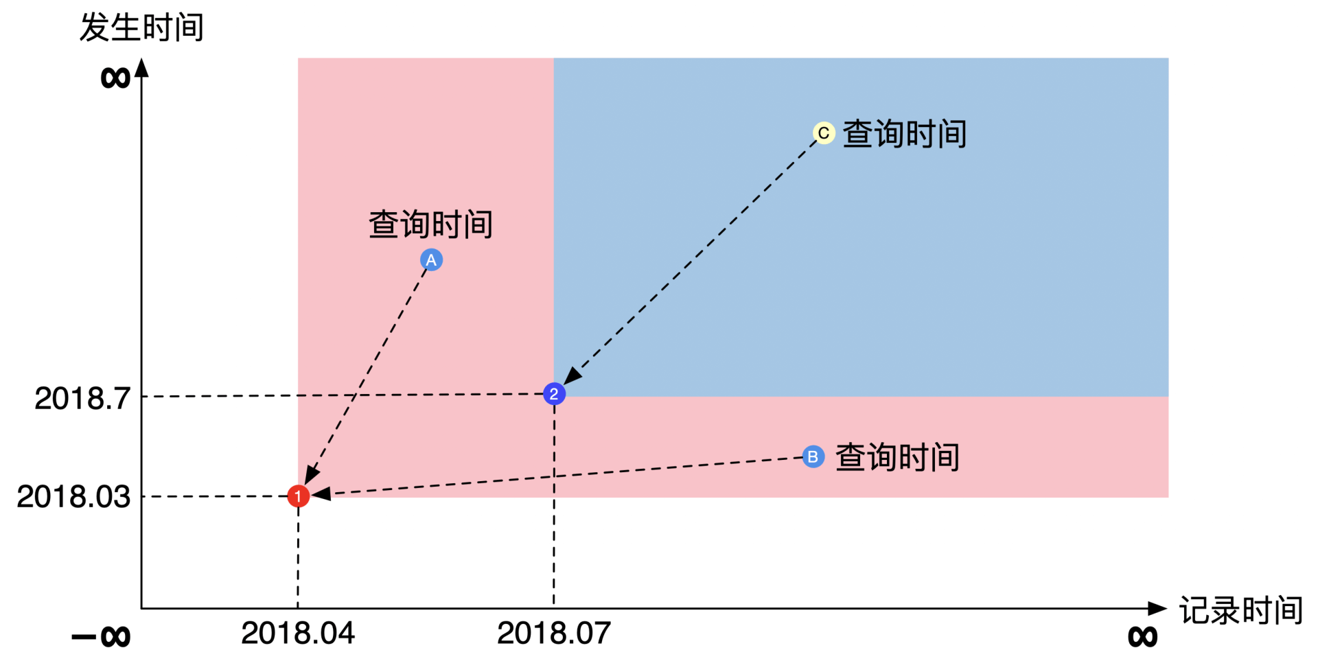 你会发现,上面图中这个坐标系里有一个粉红色的方块。这个方块表示了数据的在系统内的可见范围。那什么叫可见范围呢?这就涉及到如何查询双时序数据库的数据了。