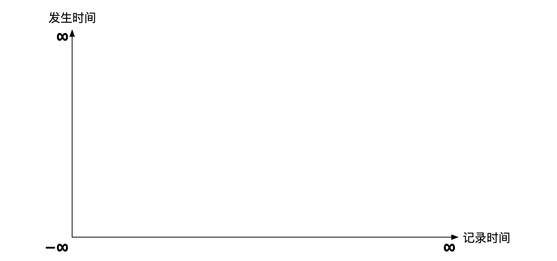 按照行业惯例,**横轴是记录时间,纵轴是发生时间。**理论上每个轴都指向正负无穷远,但是在实际展示中通常将坐标原点表示为负无穷远,主要是为了画起来好看。示意图如下: