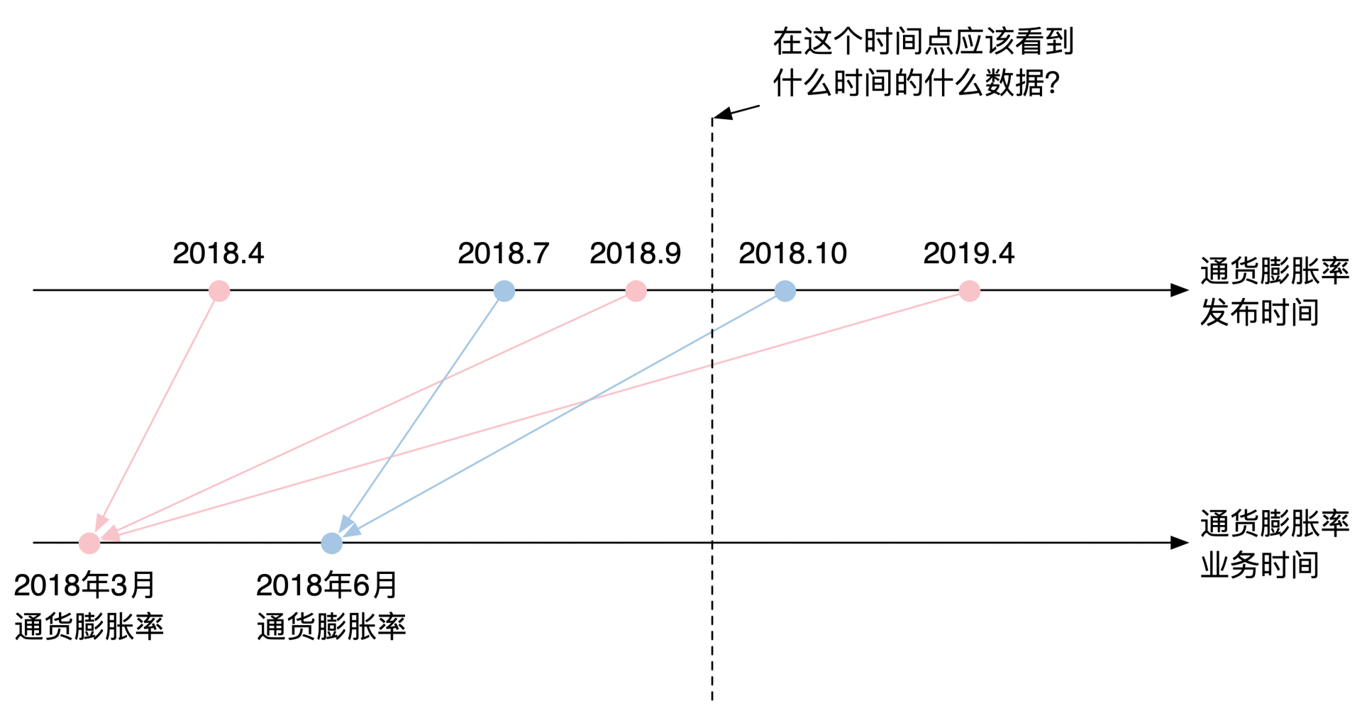 最开始提到的第二个问题也有了答案。如果你想知道每次对2018年3月的通货膨胀率的修改究竟会带来什么影响,就需要**保持2018年3月这个发生时间不变,然后依次调整记录时间。**这样就能保证你只更新了2018年3月的数据,而没有意外地用到其他月份的数据。