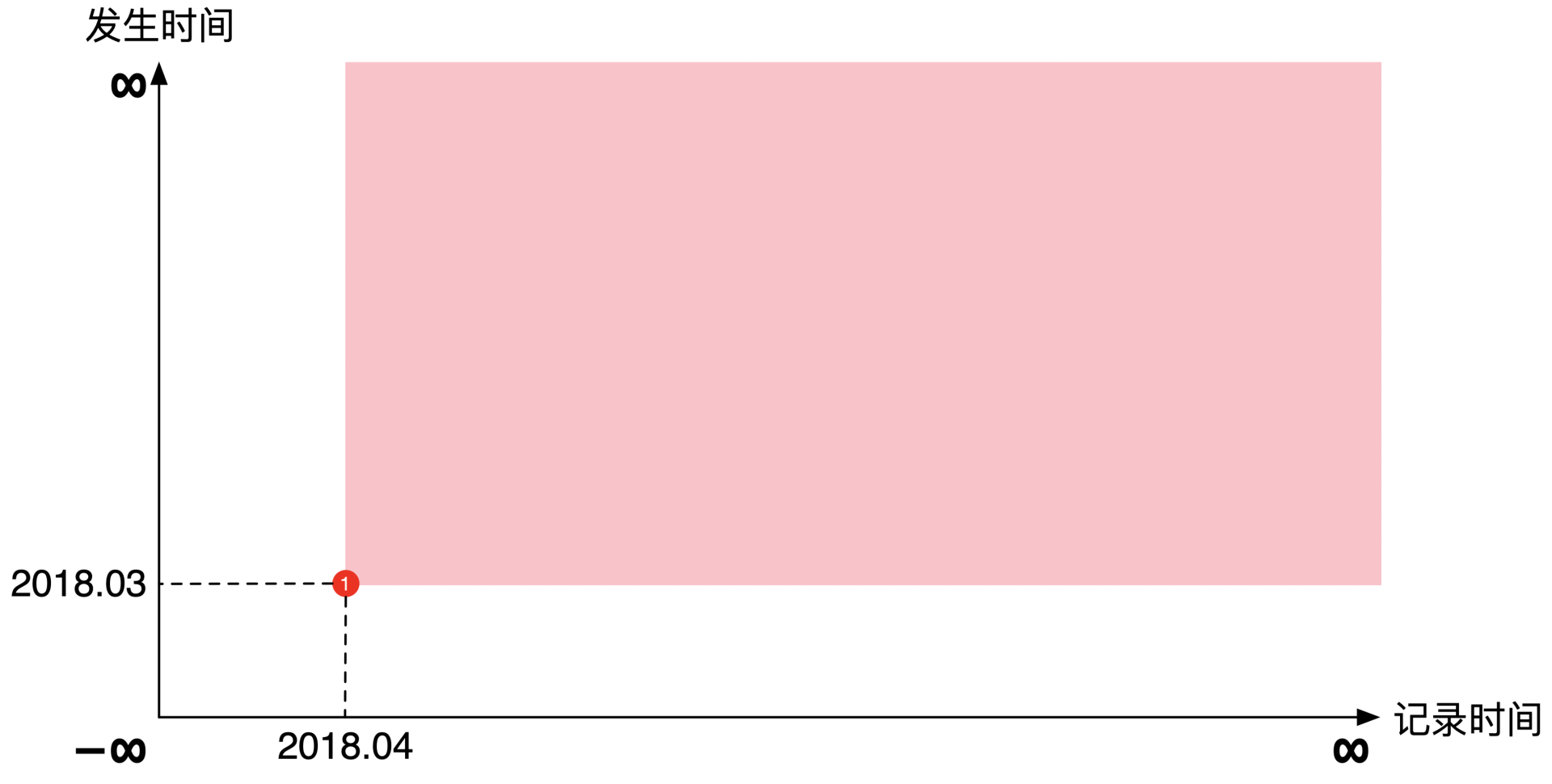 既然数据的存储有两个时间,那么数据的查询也需要同时提供两个时间,也是发生时间和记录时间。先看记录时间的逻辑。通货膨胀率的发生时间是2018年3月,这意味着这个时间点之前事件并没有发生,之前的数据没有任何意义。再看看记录时间。通货膨胀的记录时间是2018年4月,这意味着这个时间点前数据还不存在。所以可见范围指的是数据既存在而且有意义的时间范围。