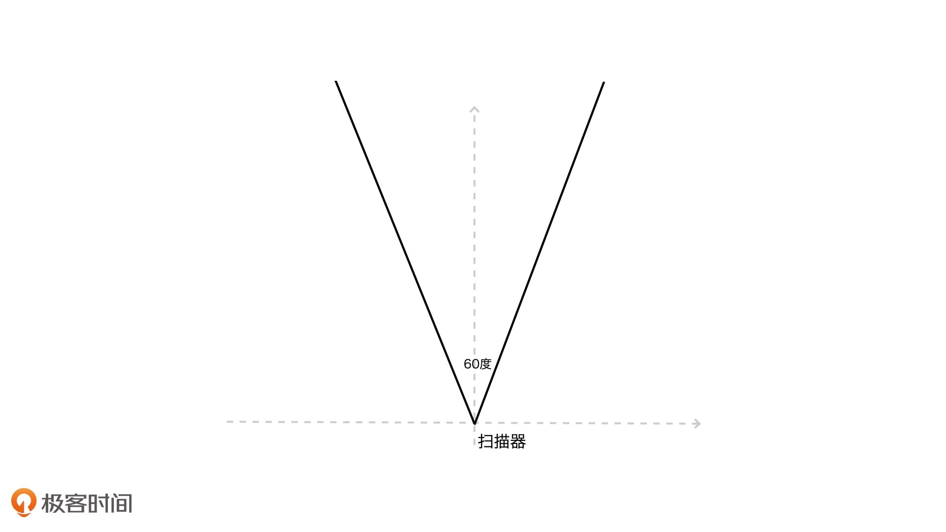 - 一个平面上放置了一个扫描器,方向延y轴方向(该坐标系y轴向上),扫描器的视角是60度。假设它可以扫描到无限远的地方,那对于平面上给定的任意一个点(x,y),我们该如何判断这个点是否处于扫描范围内呢?