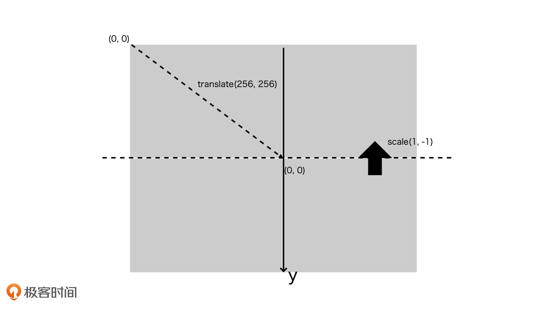 首先,我们通过translate变换将Canvas画布的坐标原点,从左上角(0, 0)点移动至(256, 256)位置,即画布的底边上的中点位置。接着,以移动了原点后新的坐标为参照,通过scale(1, -1)将y轴向下的部分,即y>0的部分沿x轴翻转180度,这样坐标系就变成以画布底边中点为原点,x轴向右,y轴向上的坐标系了。
