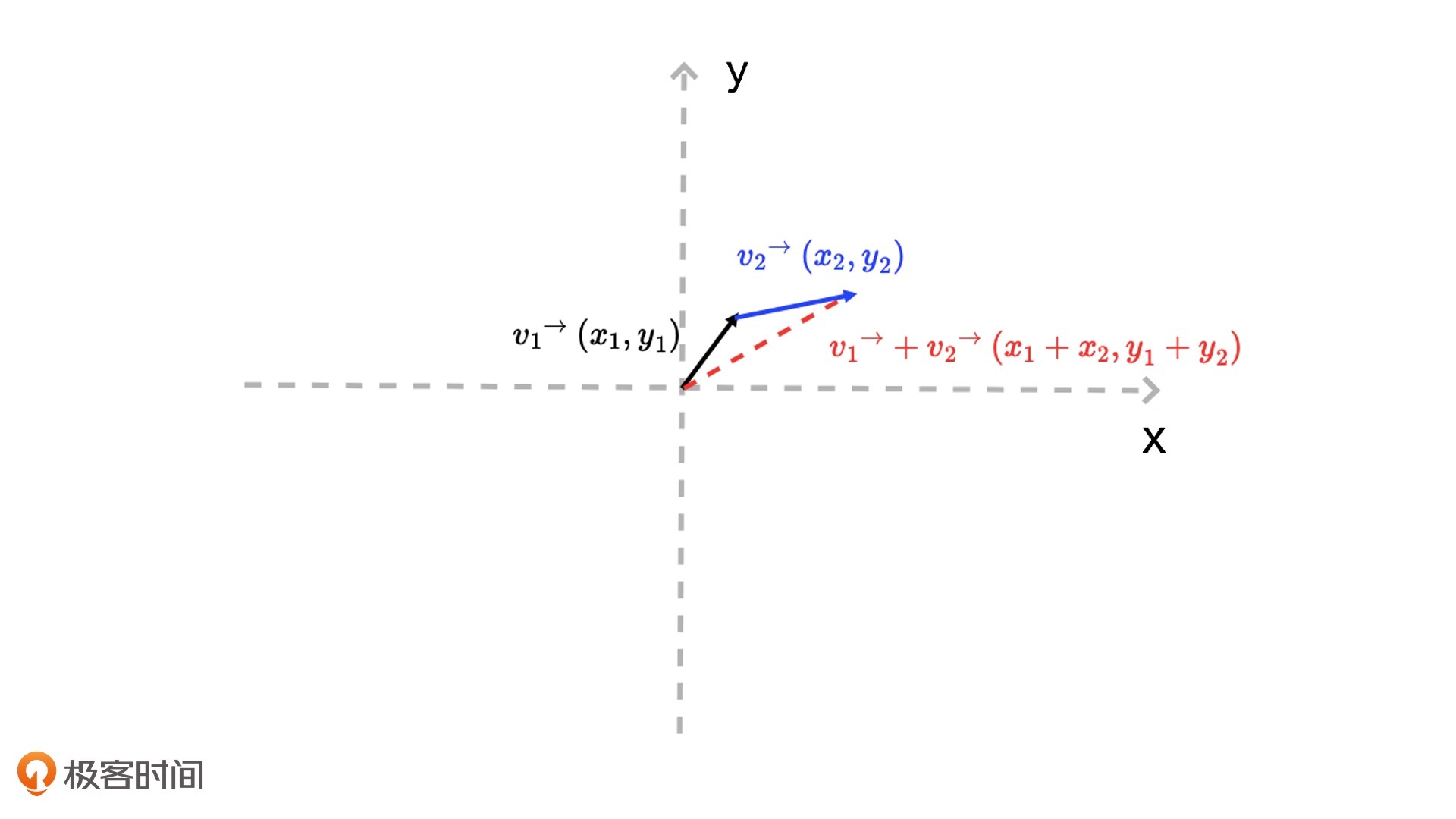 **首先,向量和标量一样可以进行数学运算。**举个例子,现在有两个向量,v1和v2,如果让它们相加,其结果相当于将v1向量的终点(x1, y1),沿着v2向量的方向移动一段距离,这段距离等于v2向量的长度。这样,我们就可以在平面上得到一个新的点(x1 + x2, y1 + y2),一条新的线段[(0, 0), (x1 + x2, y1 + y2)],以及一段折线:[(0, 0), (x1, y1) , (x1 + x2, y1 + y2)]。
