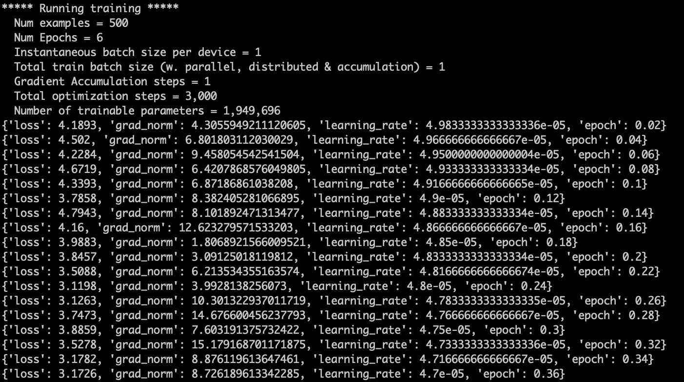 我们这次微调trainable params为1.9M(190万),整个参数量是6B(62亿),训练比为3%。