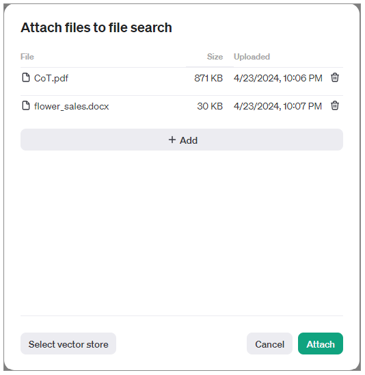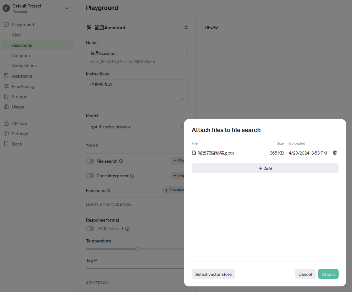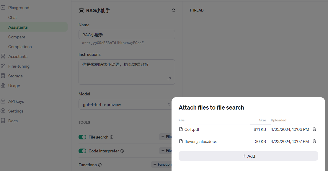 第二步,开启File search功能,并通过Add功能上传数据文件。此处,要注意的是,目前只有较新的模型,如gpt-4-turbo-preview有这个功能。