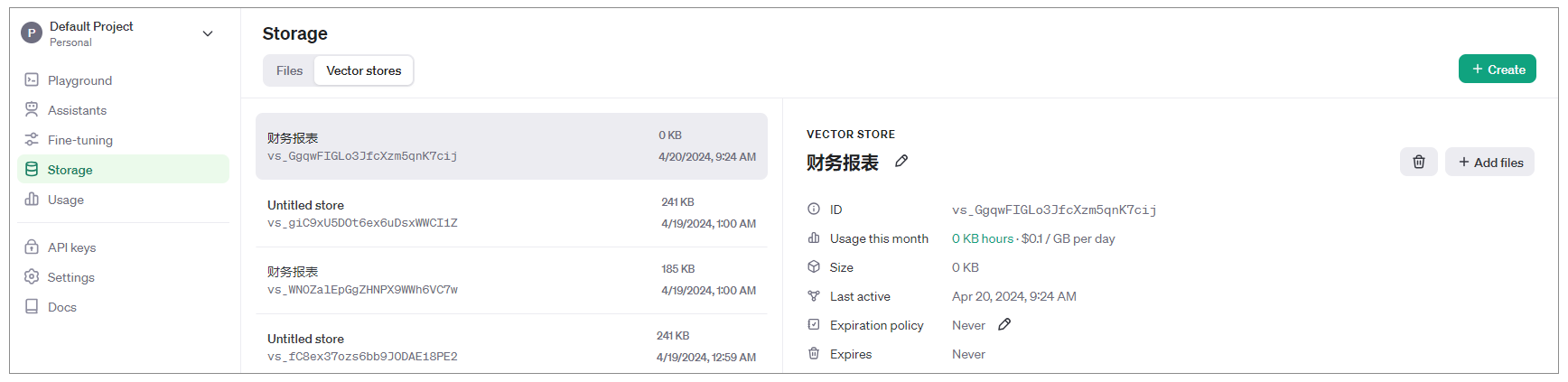 不过,如果我们不选择任何一个向量存储库(也就是Vector Stores)的ID,OpenAI也会把文件存储在Storage的Files中,而且会为这些文件自动创建一个向量存储库,如下图所示。