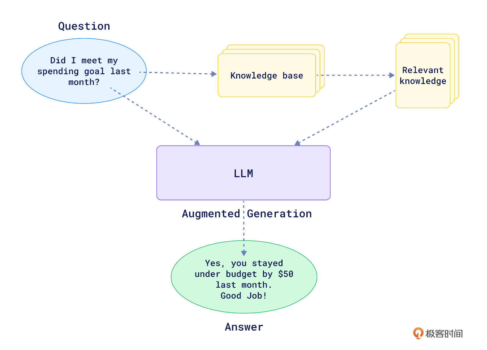 用户先提出一个问题,如 “Did I meet my spending goal last month?”。 RAG系统从知识库中检索出与问题最相关的片段,比如上个月的支出数据报告。 然后系统将原始问题和检索到的相关知识一起输入到LLM中。 LLM根据问题和相关背景知识,生成最终的回答:“Yes, you stayed under budget by $50 last month. Good Job!” 可以看到,RAG赋予了LLM利用外部知识库进行问答的能力。关键就在于Retrieval首先过滤掉了大量无关信息,只提取最相关的少量片段给LLM。这一方面降低了对LLM记忆容量的要求,另一方面也提高了LLM输出内容的准确性和可解释性。