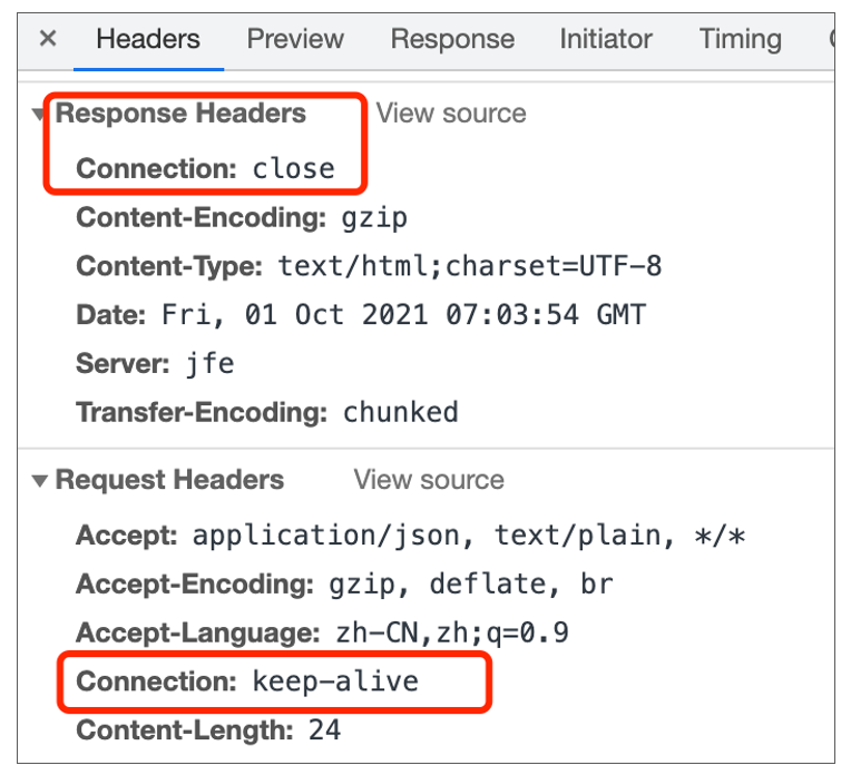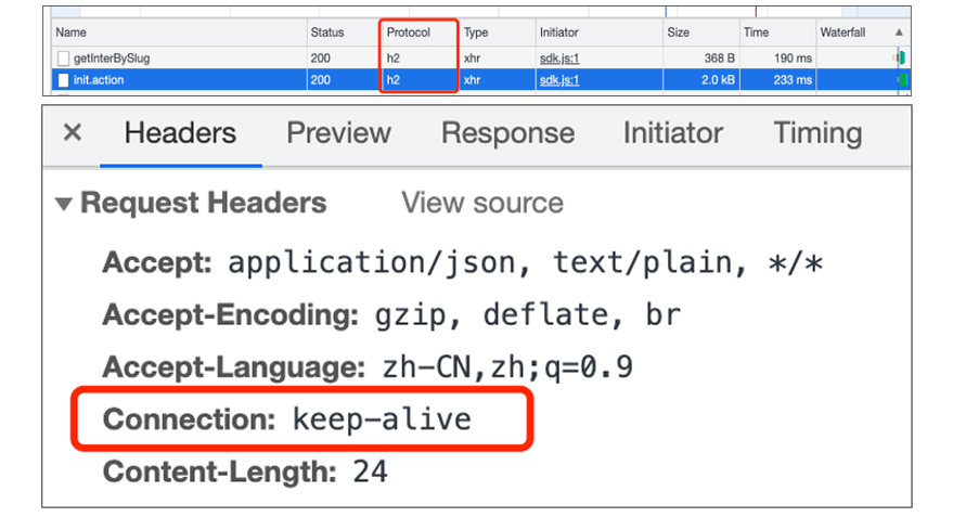 协议版本是HTTP2.0的话,如果没有特殊配置,请求头里会有keep-alive的设置。但我们可以在Nginx通过配置空闲连接的存活时间为0,来关闭长连接,使其变成短连接。效果如下: