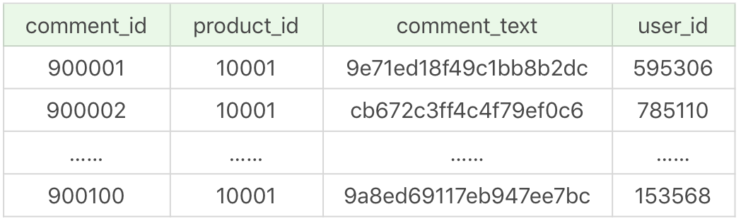 1 | mysql> SELECT comment_id, product_id, comment_text, user_id FROM product_comment WHERE comment_id BETWEEN 900001 AND 900100; |