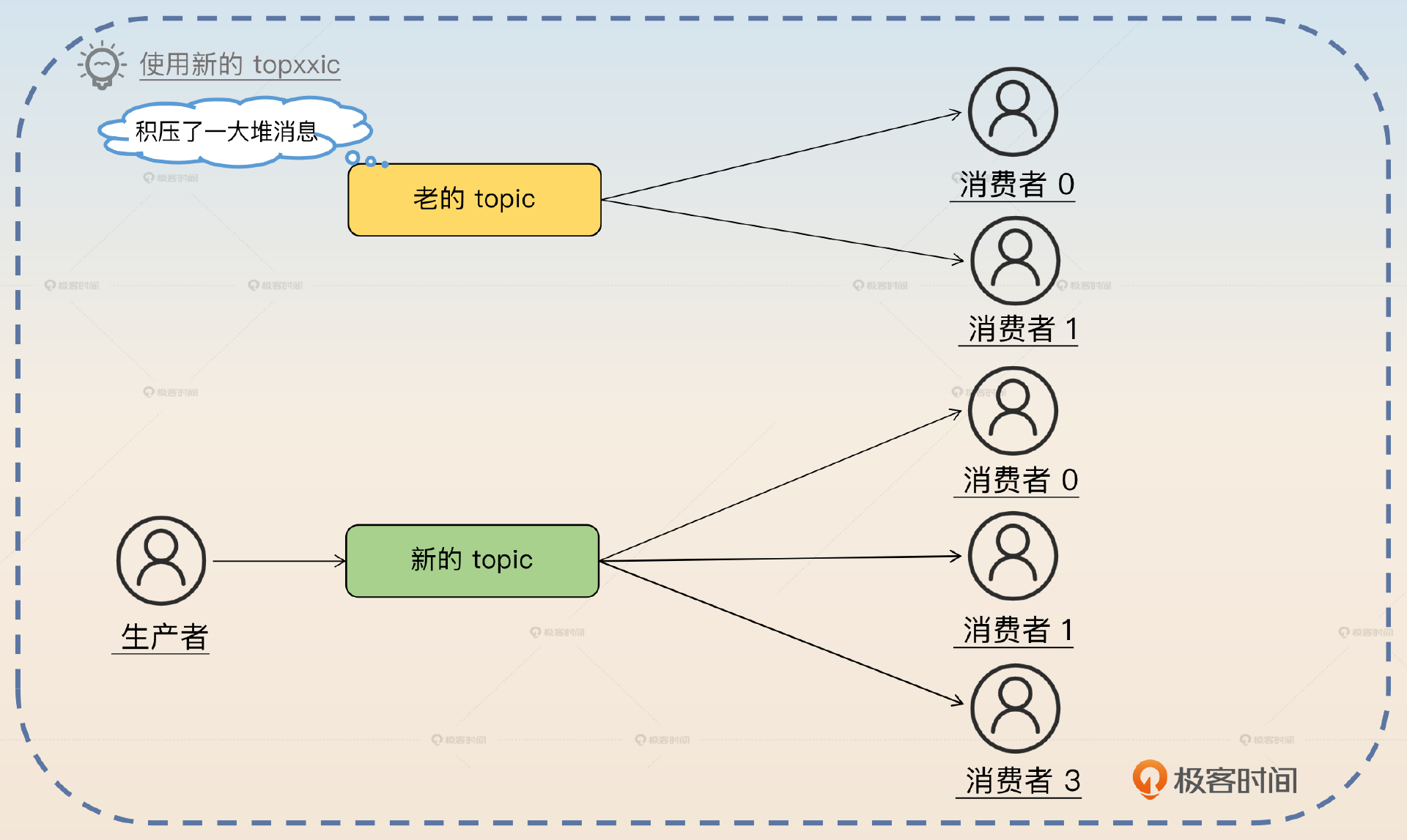 这种做法还有一个变种,就是当你创建了新 topic 之后,把老 topic 上已有的消息转发到这个新的 topic 里面。这样你只需要启动消费者消费新 topic 就可以了。
