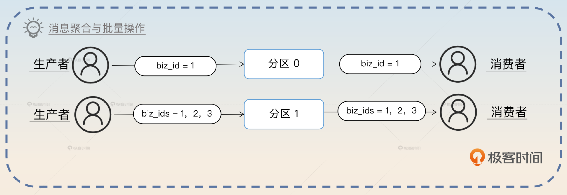 还有一种思路是聚合消息和批量操作来优化性能。之前我有一个业务,生产者那边是按照用户输入的参数来查找符合条件的数据,然后一条条处理的。每条数据处理完毕之后就发送一条消息到消息队列里面。简单来说,就是消息里会带上业务 ID。同时消费者消费消息,根据业务 ID 进一步处理。