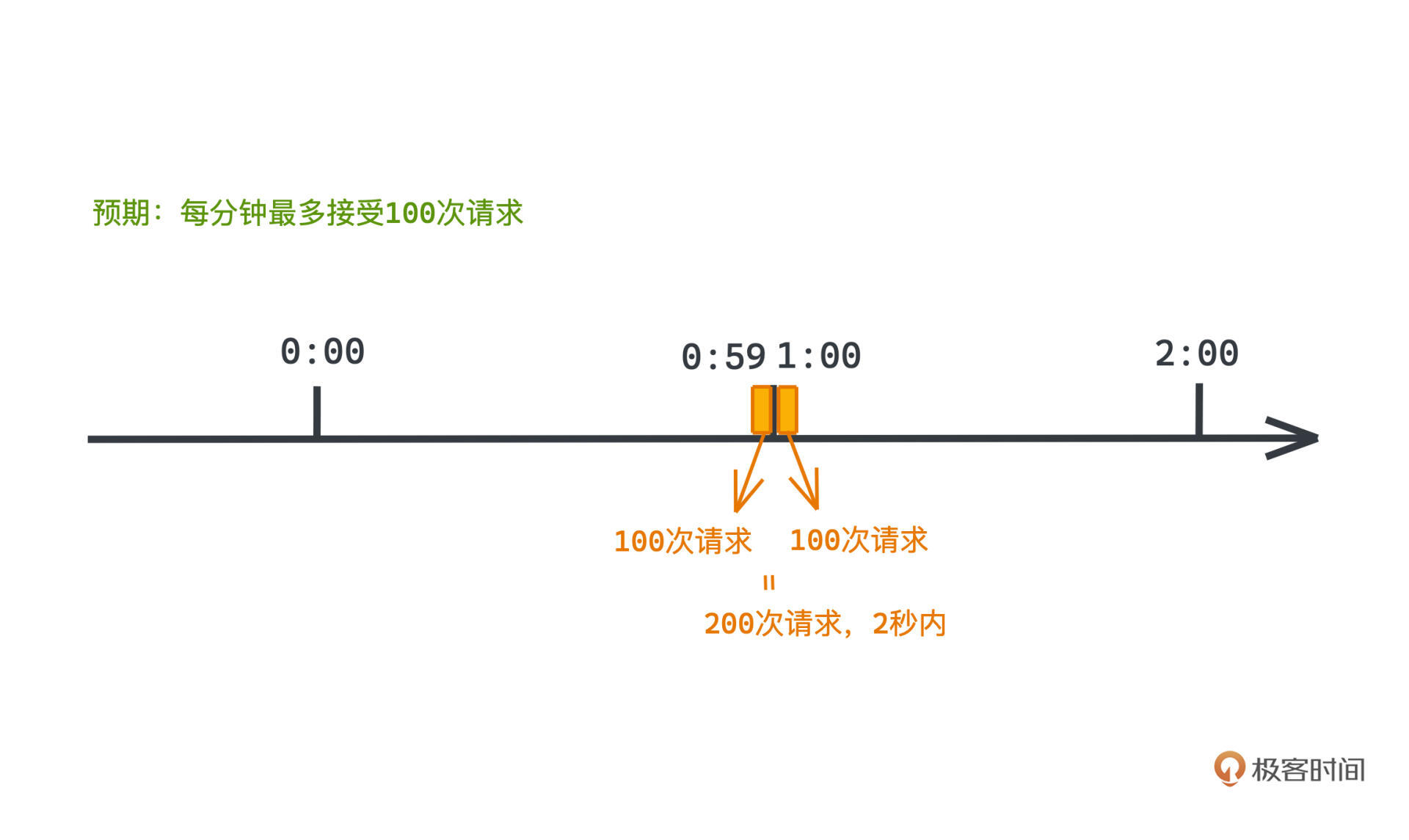 在每分钟100次请求的限流器中,如果在59秒和1分整这两个时刻内,用户快速请求了200次请求,那么在这2秒内,用户其实就进行了200次请求,而我们建设这个限流器的预期是每分钟最多接受100次请求,这显然和我们的预期有着巨大的鸿沟。