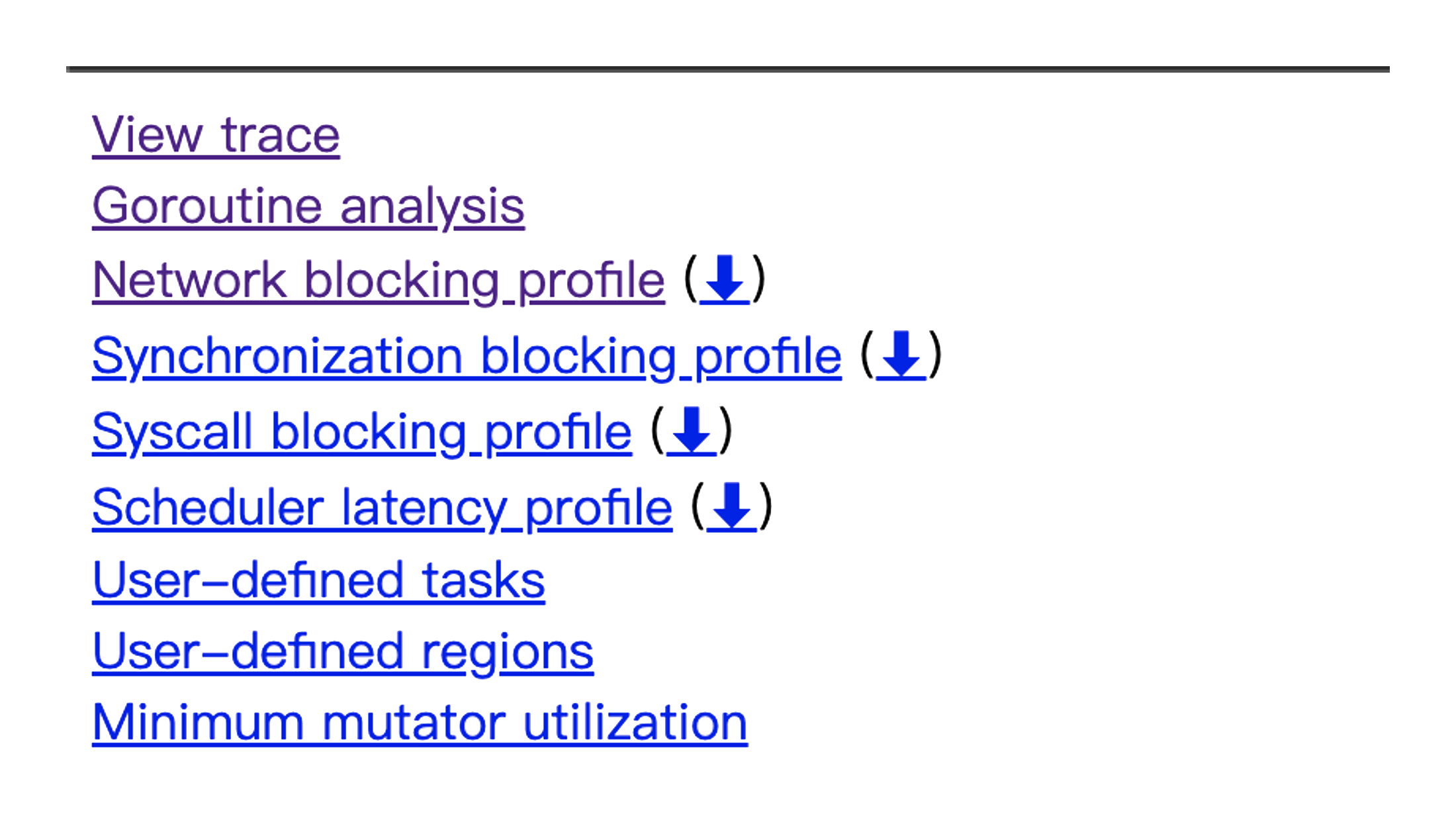 通过 pprof 的分析,我们能够知道一段时间内的CPU 占用、内存分配、协程堆栈信息。这些信息都是一段时间内数据的汇总,但是它并不能让我们了解整个周期内发生的具体事件,例如指定的 Goroutines 何时执行,执行了多长时间,什么时候陷入了堵塞,什么时候解除了堵塞,GC 是怎么影响单个 Goroutine 的执行的,STW 中断花费的时间是否太长等。而这正是 Go1.5 之后推出的trace 工具的强项,它提供了指定时间内程序中各事件的完整信息,具体如下。