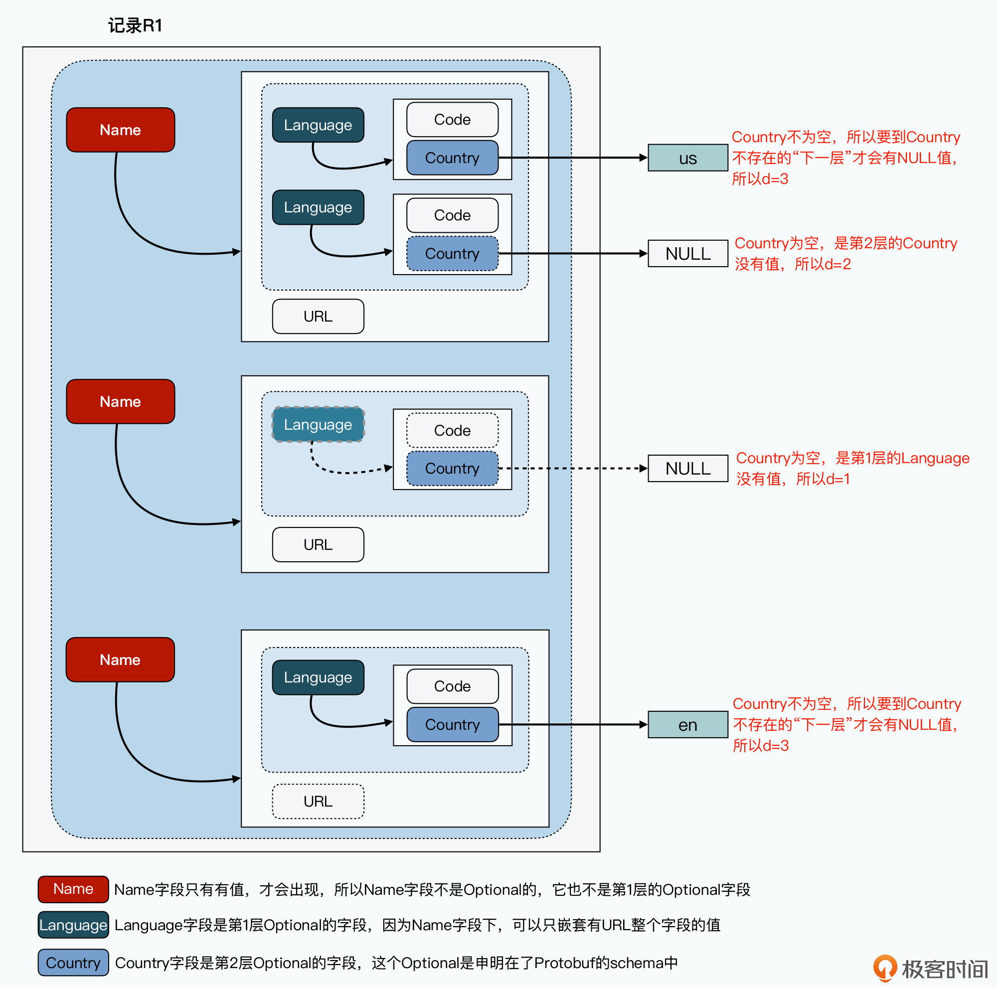 这里你可以看到,第一个Country的值是'us',那么它的d就是Country本身,作为Optional字段嵌套的层数加1,也就是d=3;第二和第三个值为null,但是它们的Definition Level并不一样,分别是2和1。