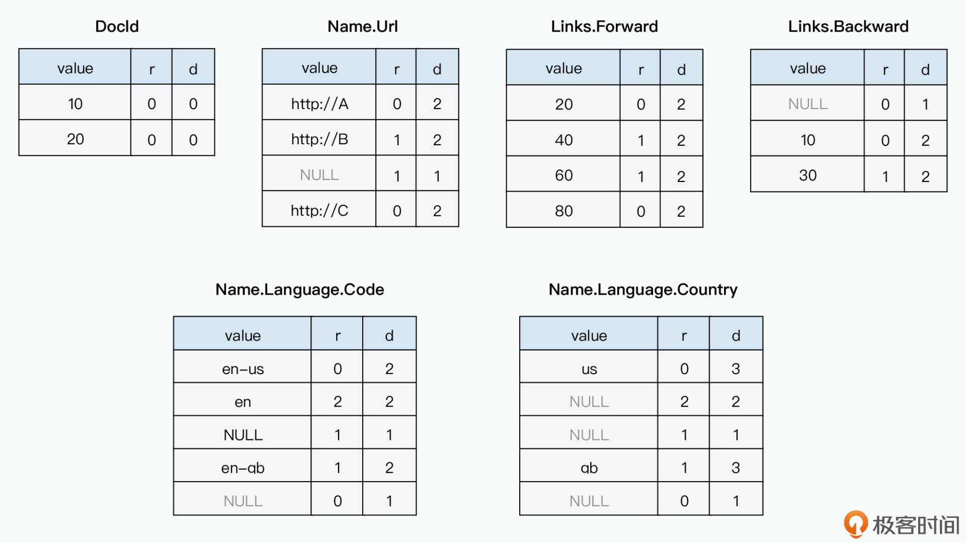 所以即使我们知道,前面的示意图里,Name.Language.Code的连续三个值都属于记录r1,但是我们没法儿知道,它是属于里面的Name这个List里的第一个Name,还是第二个Name。其他多层嵌套的字段也有类似的问题。而且更进一步的,Dremel支持Optional的字段,也就是说,Name下面可能有Language字段,也可能没有。