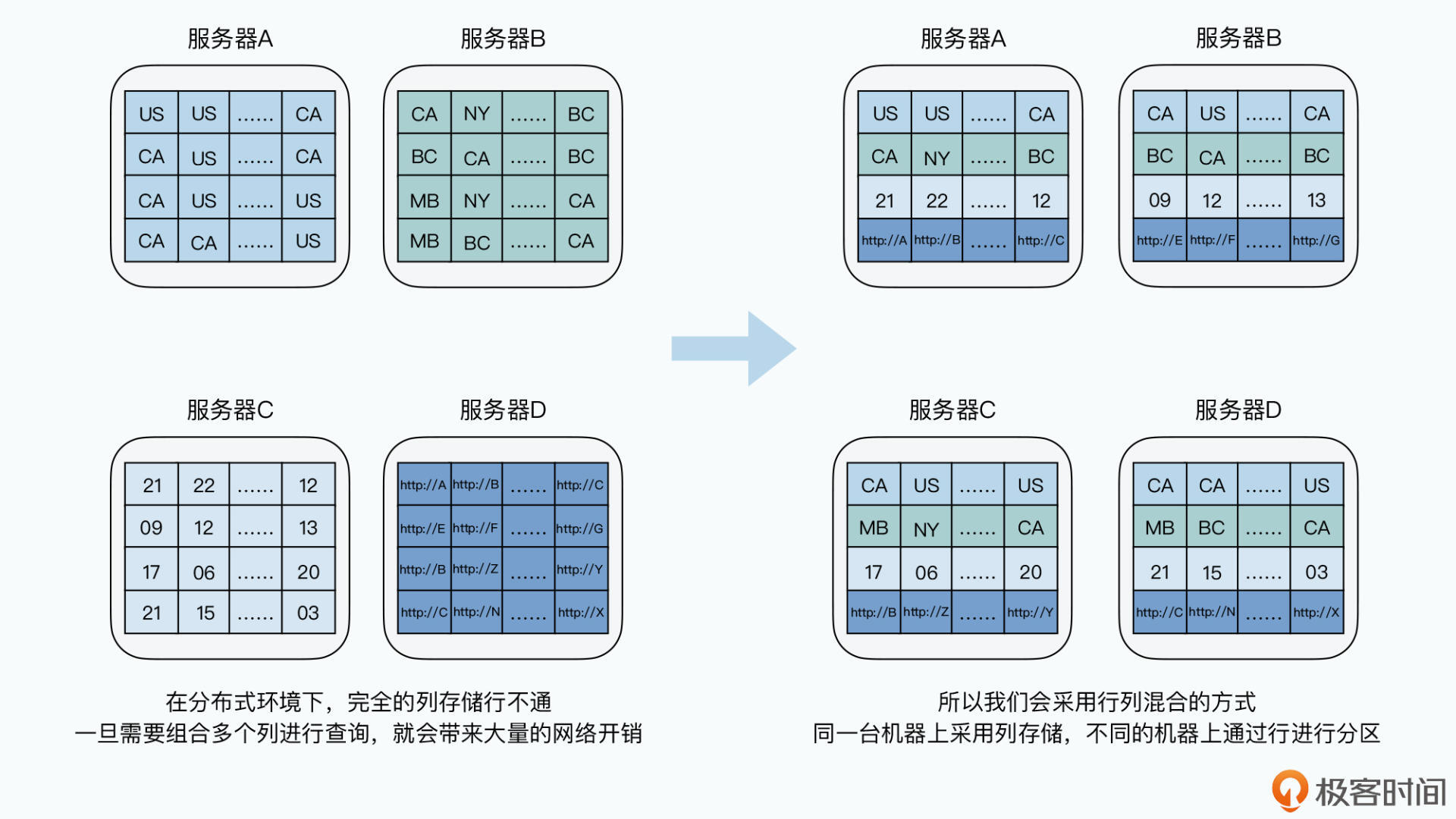 所以,更合理的解决方案是行列混合存储。因为,我们需要把一批行相同的数据,放在同一个服务器上。