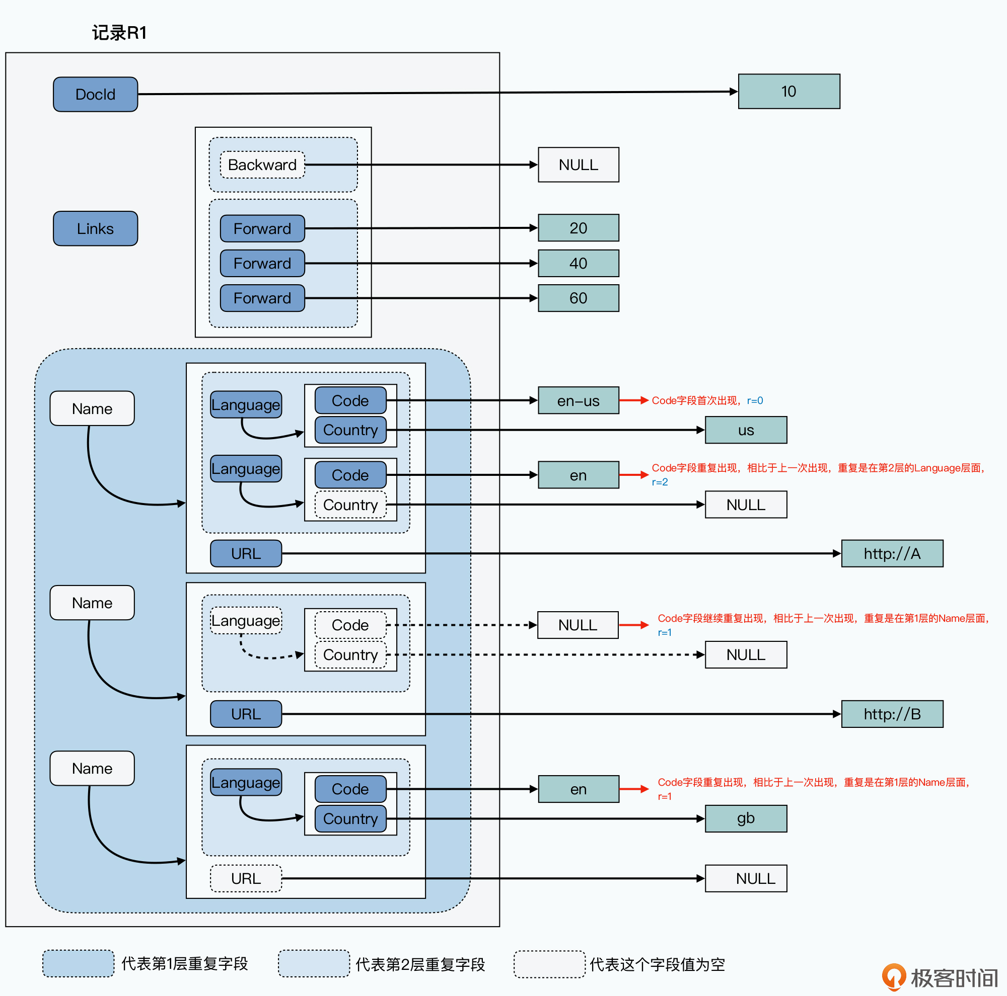 'en',它的r=2,也就是说,这是一条重复出现的记录,并且,它是在第2层重复出现的。所以你可以看到,这个'en'在原来的结构当中,是新出现了同一个Name下的Lanuage,而不是新出现了一个第1层的Name。 - 存放的第三个值null,说明这个Name.Language.Code的值为空,而r=1,说明它也还是重复出现的一条记录,不过这次它是在第1层重复出现的了。也就是一个新的Name,这就对应着r1里面,URL为