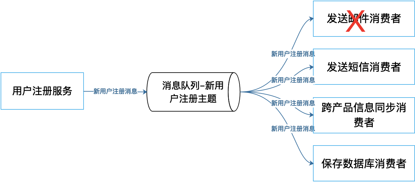 发送邮件消费者出现故障,不会影响生产者应用的运行,也不会影响发送短信等其他消费者正常的运行。