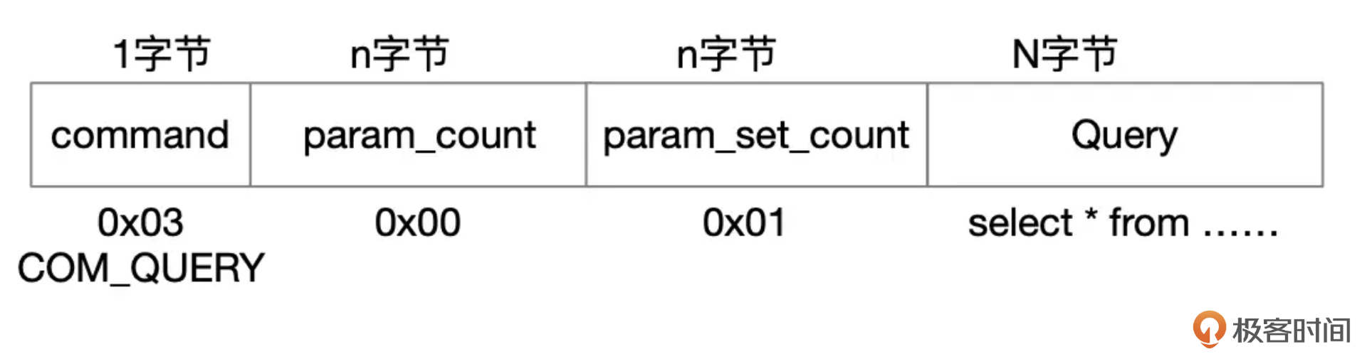 length为3个字节,标识包的长度,一个包最大长度为16M。超过16M的部分需要拆成多个包,seq是包的序号,payload是具体的协议数据。对于一个SELECT查询语句,客户端发送的请求包格式大致上就是下面图片中展示的这样。其中command是命令的类型,目前MySQL中总共定义了几十种类型,对于查询语句,command是COM_QUERY。