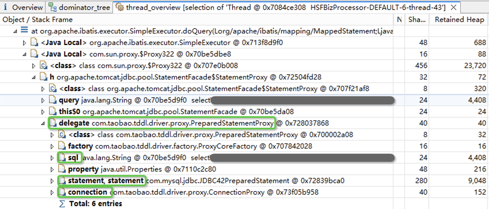 在thread_overview菜单页中,我们可以看到线程的调用栈。内存主要由handleResultSet的局部变量占用,而SQL语句可能是在SimpleExecutor.doQuery方法中发起的。