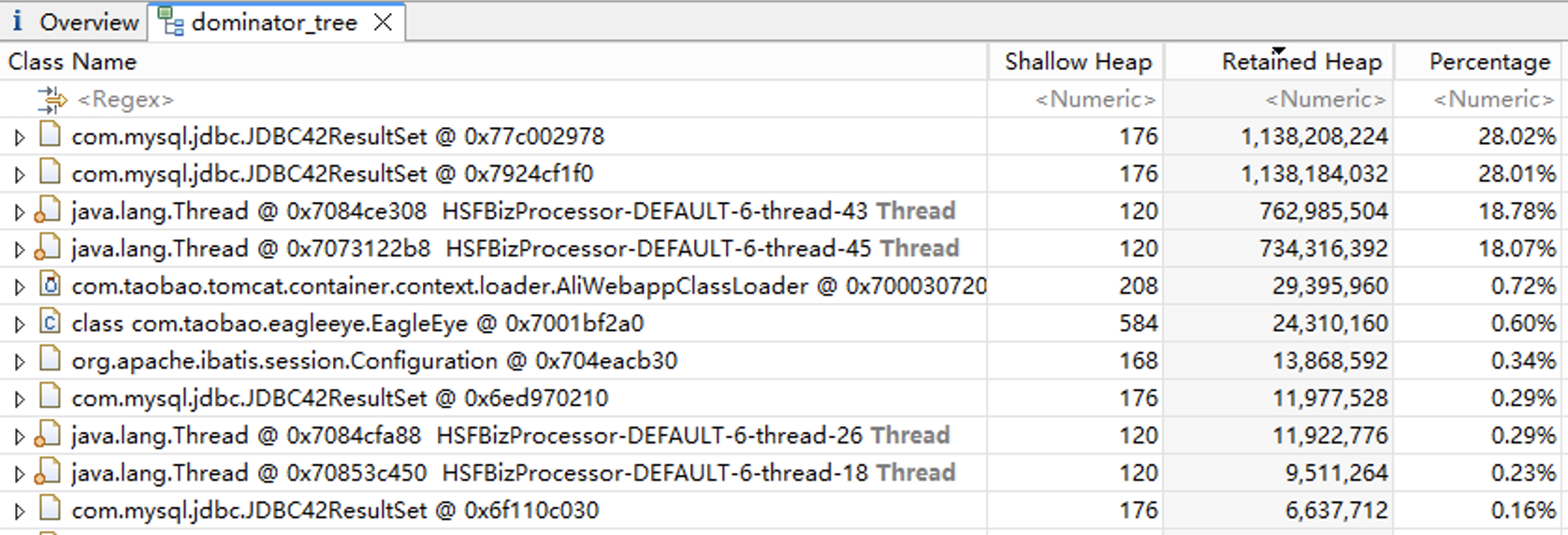 进入Dominator Tree模块,查看内存占用最高的对象。这里我们主要关注的是Retained Heap这一列,也就是对象本身加上该对象引用的其他对象占用的内存总和。我们的Dump文件中,主要是JDBC42ResultSet和Thread对象,总共占用了超过90%的内存。