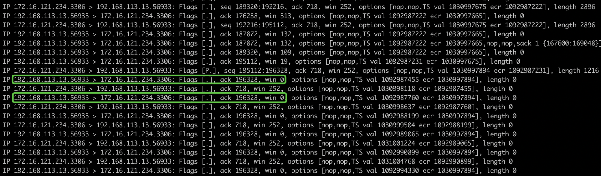 如果我们使用tcpdump对MySQL进行抓包分析,会发现执行cur.execute()这一行代码后,服务端向客户端发送了一些数据后就停止发送了,这个时候客户端的TCP接收窗口为0。