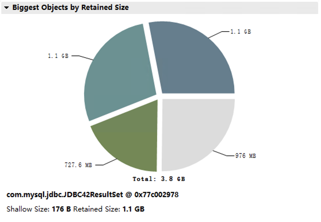 打开Dump文件后,从总览页面可以看到内存消耗最高的那些对象。在我们这个Dump文件中,内存占用最高的是JDBC42ResultSet,从名字我们猜测这应该是从数据库取回的结果集。