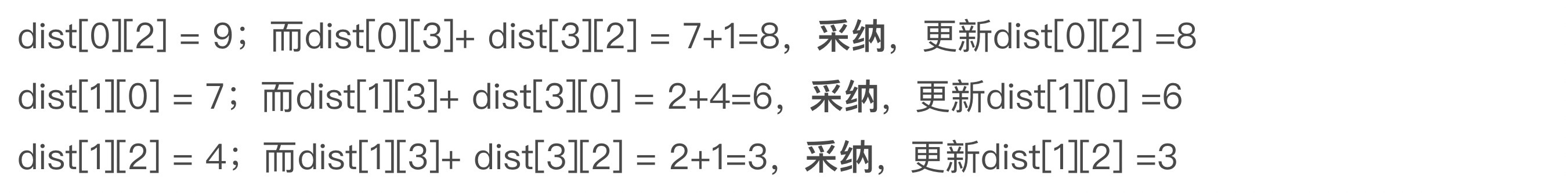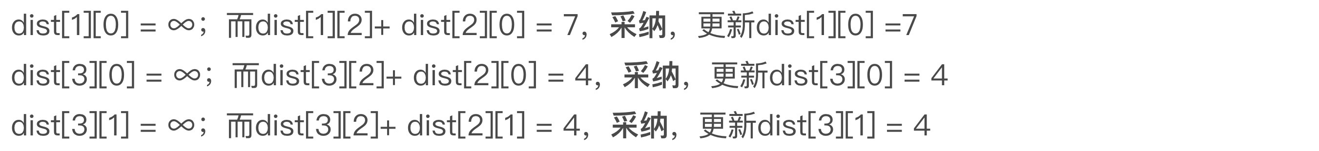 dist[1][2] = 4;而dist[1][0]+ dist[0][2] = ∞,忽略(后续忽略的将不再写出)。