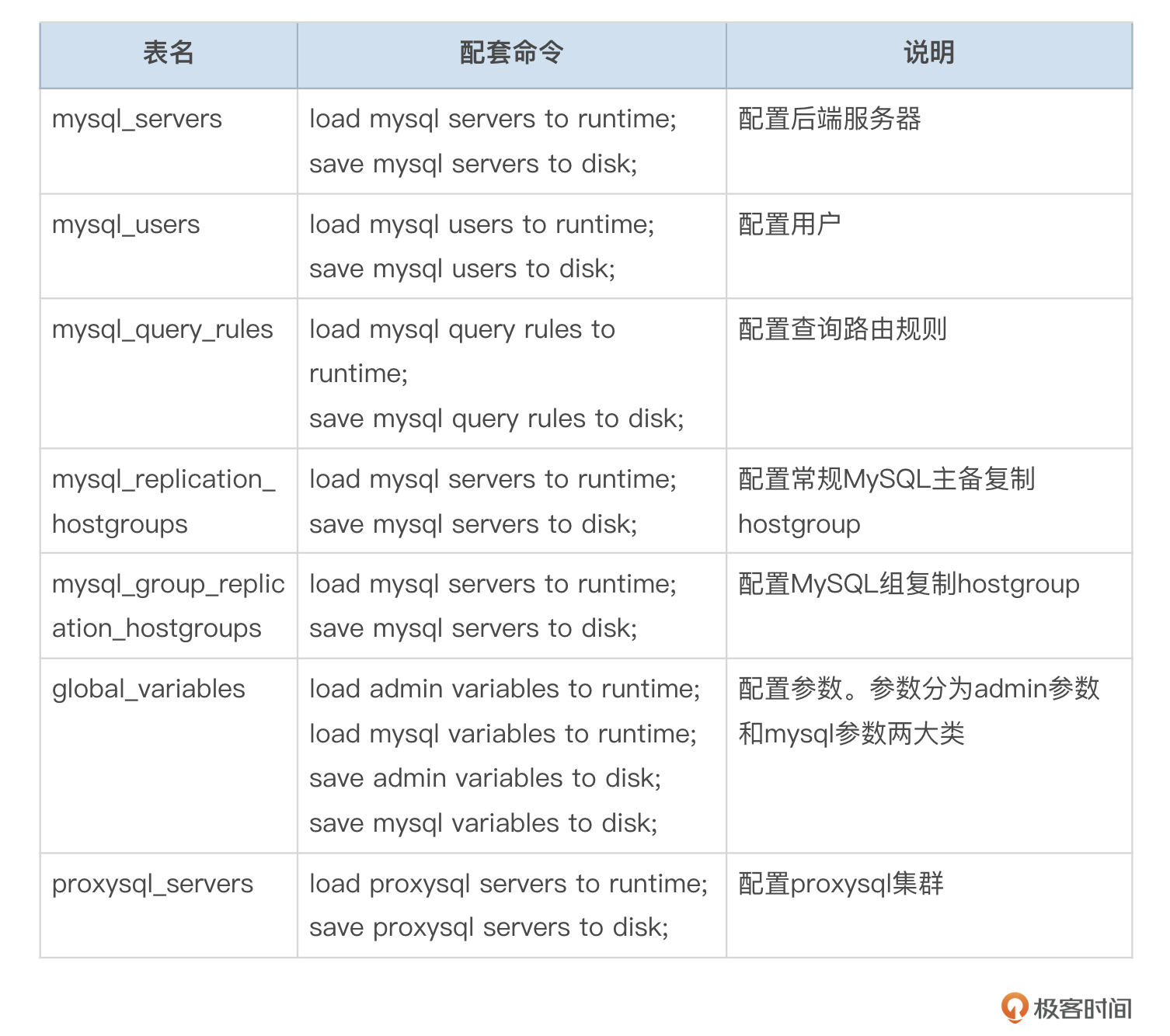 main:内存数据库。这个库里的表分两类,runtime开头的表存的是当前实际生效的配置。其它表存的是配置值,可通过load命令加载到runtime中,通过save命令持久化到磁盘中。 disk:sqllite数据库。proxysql启动时从这个数据库加载配置项。 常用的一些配置表,我整理到了这个表格中,后续我会通过一些具体的例子来介绍这些表的使用方法。