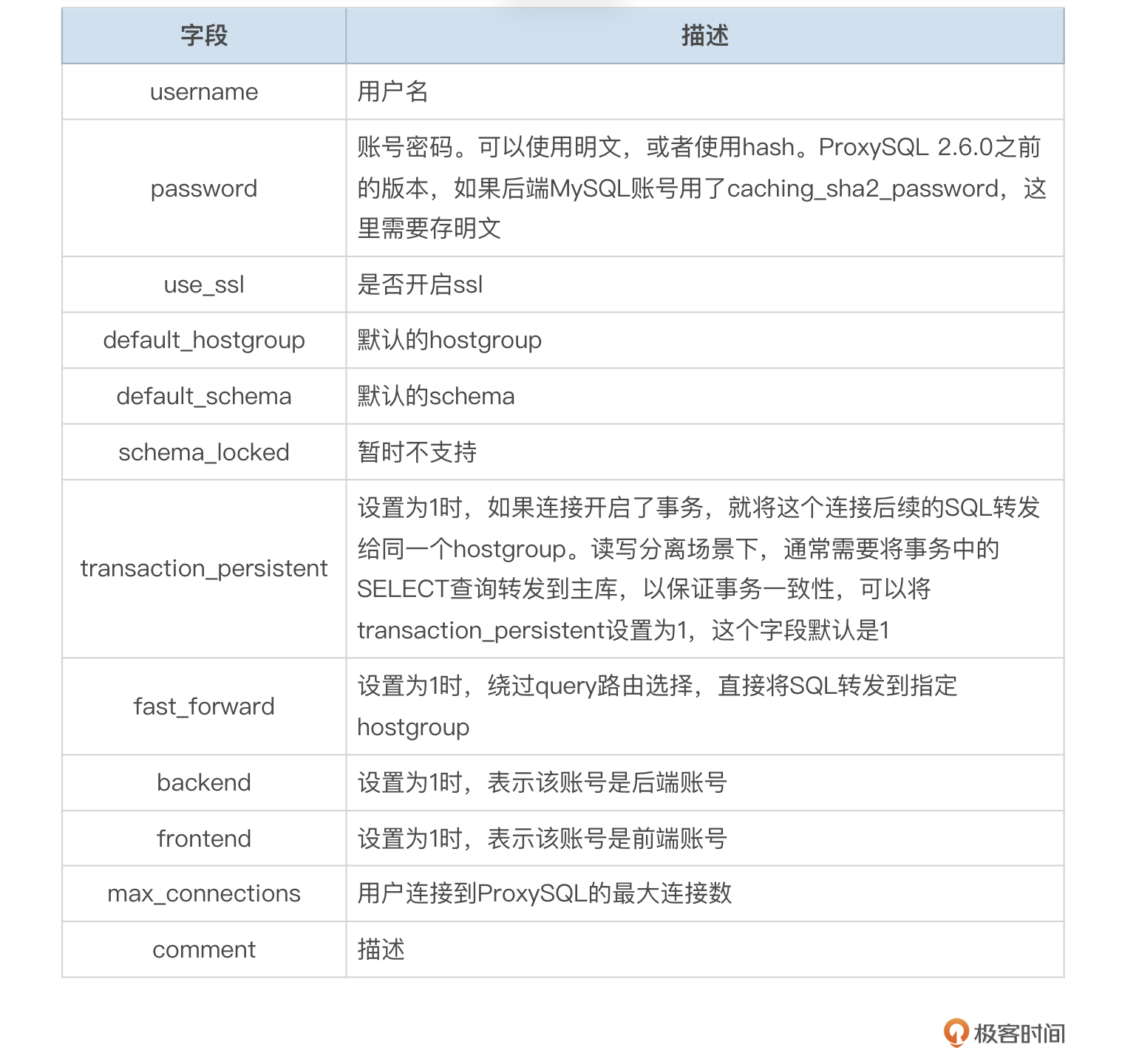 ProxySQL配置表参考 ProxySQL的配置主要通过一些配置表来实现。这里我对文章中用到的几个配置表做一个简单的说明,方便你查看。更详细的信息,你可以看官方文档 。