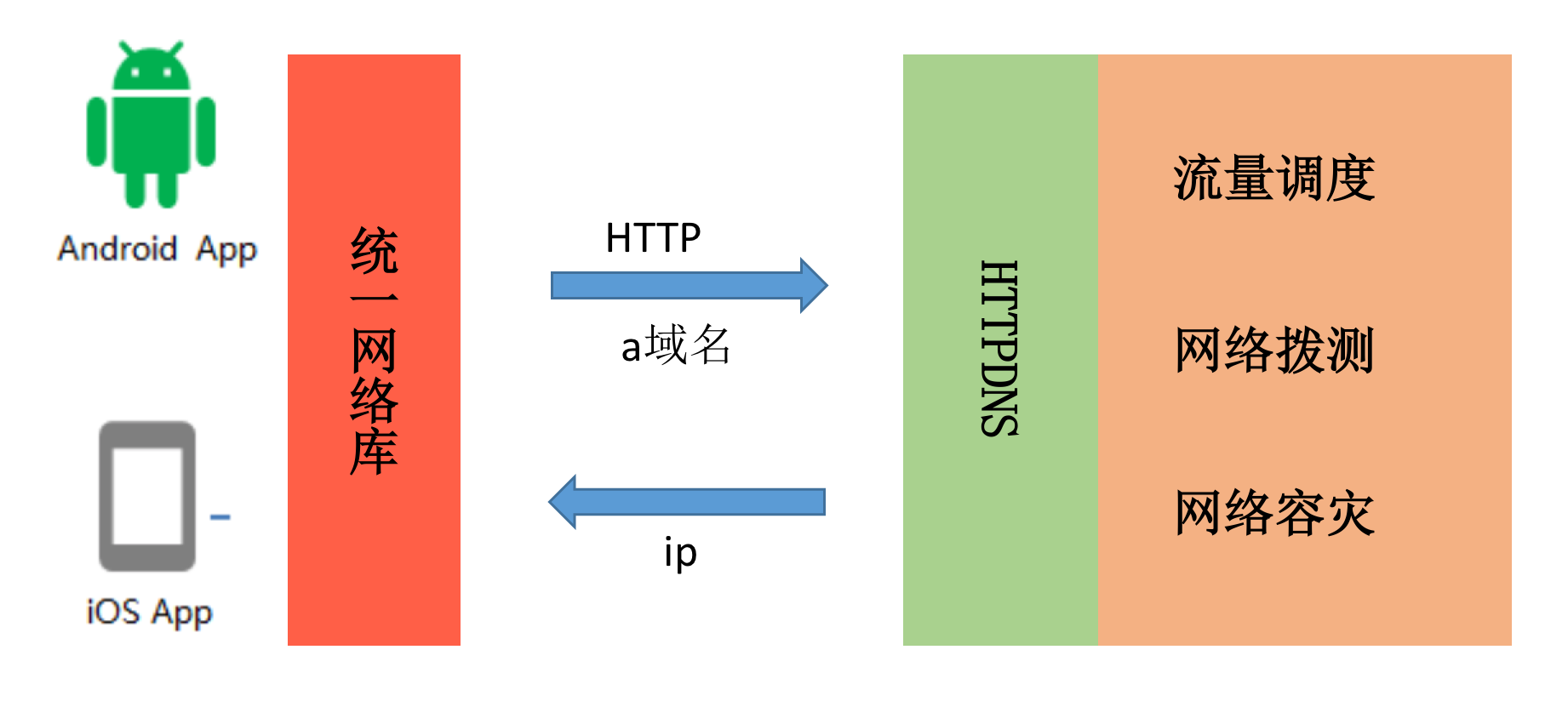 微信有自己部署的NEWDNS,阿里云和腾讯云也有提供自己的HTTPDNS服务。对于大网络平台来说,我们会有统一的HTTPDNS服务,并将它和运维系统打通。在传统的DNS基础上,还会增加精准的流量调度、网络拨测/灰度、网络容灾等功能。