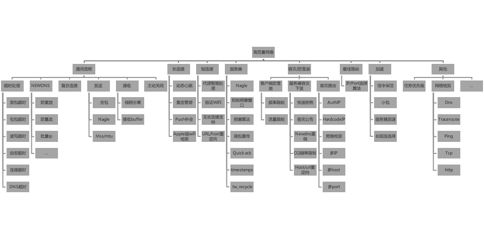 - 弱网络。移动端网络复杂多变,在出现网络连接不稳定的时候,怎样最大程度保证网络的连通性。