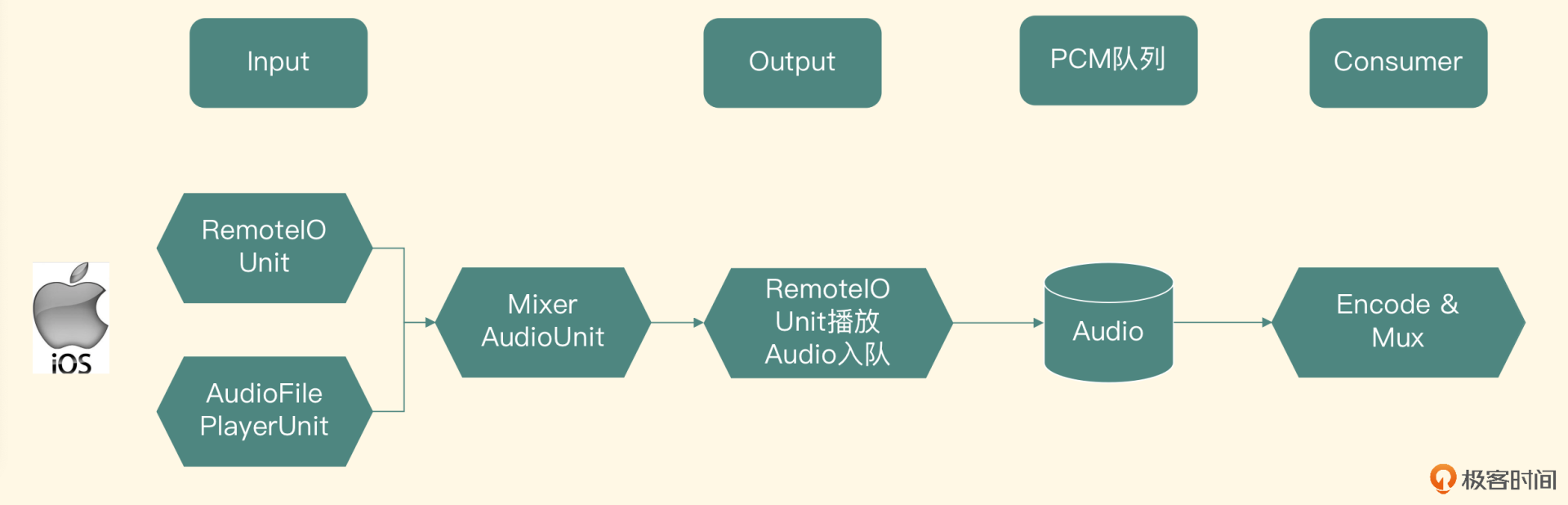 - 采集人声应该使用RemoteIO这个AudioUnit,启用它的InputElement采集人声数据。采集到人声之后,如果要做处理直接在AUGraph里加入音效的AudioUnit节点,最终汇入MixerAudioUnit里。