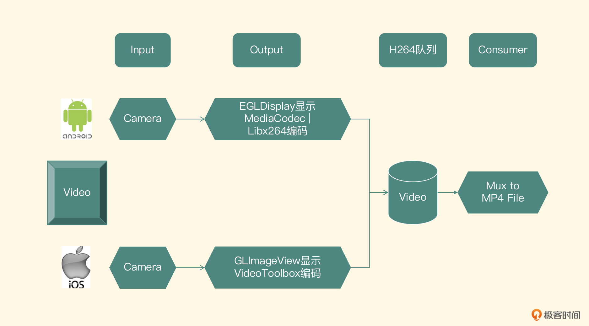 视频架构会更简单一些,输入模块就是摄像头采集图像,输出模块包含两部分,一部分是让用户预览到图像,另外一部分是编码成H264的码流放到队列里,消费者模块从队列里获取数据并合并到最终的MP4文件里。