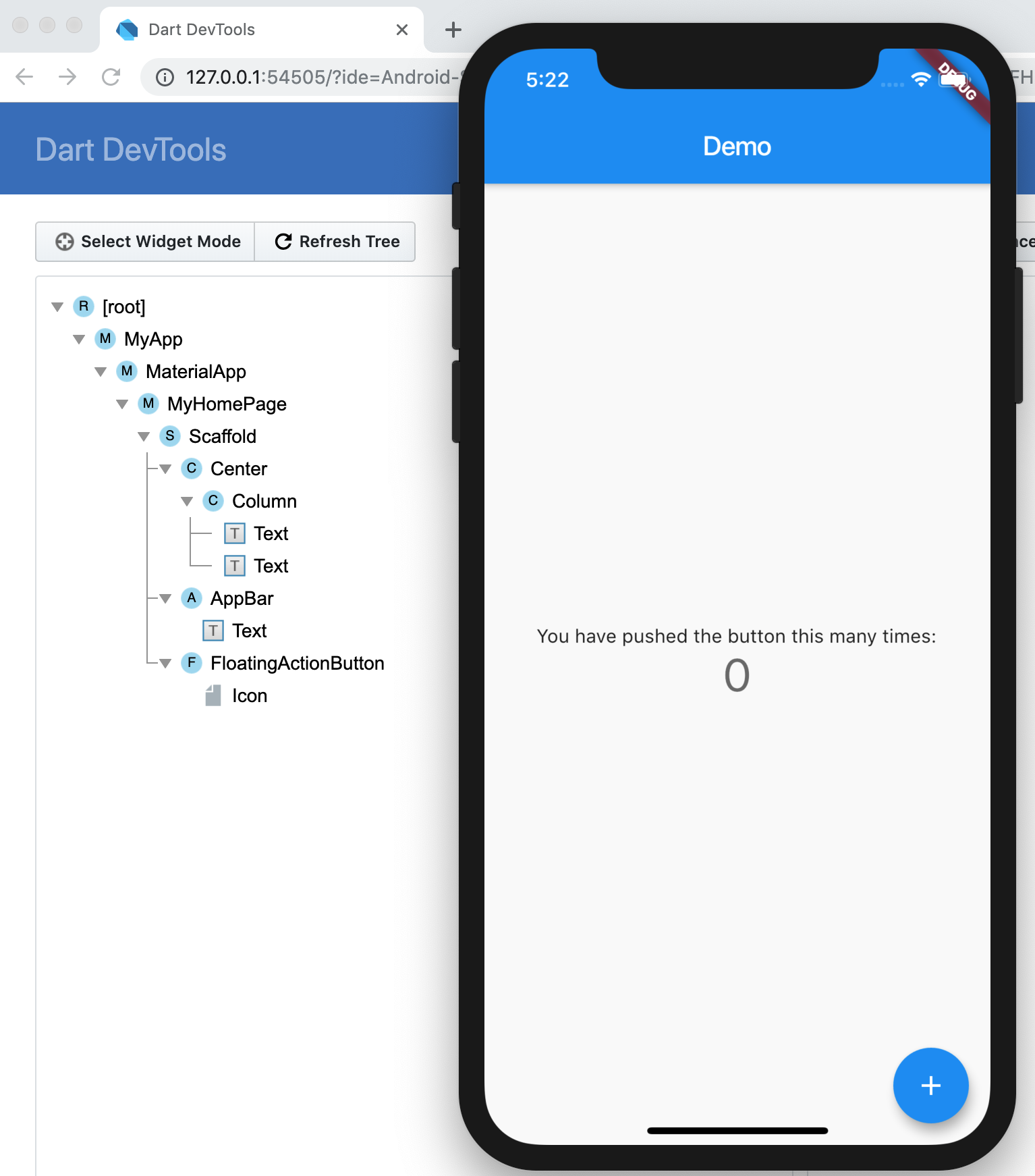 随后,Android Studio会打开浏览器,将计数器示例中的Widget树结构展示在面板中。可以看到,Flutter Inspector所展示的Widget树结构,与代码中实现的Widget层次是一一对应的。