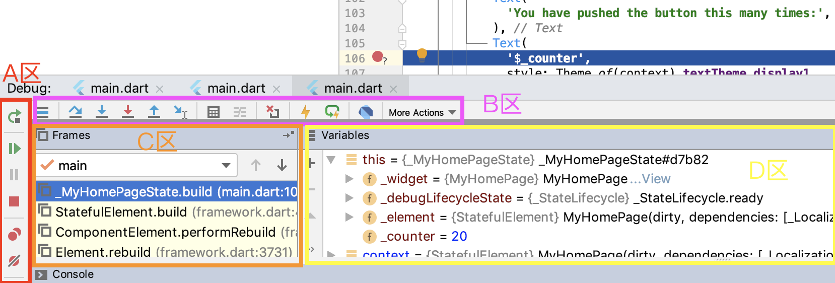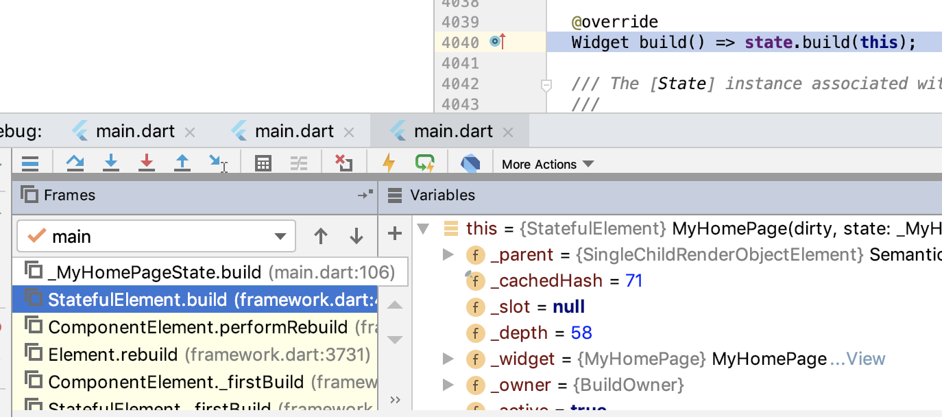 在这个例子中,我们的断点是在_MyHomePageState类中的build方法设置的,因此D区显示的也是build方法上下文所包含的变量信息(比如_counter、_widget、this、_element等)。如果我们想切换到_MyHomePageState的build方法执行堆栈中的其他函数(比如StatefulElement.build),查看相关上下文的变量信息时,只需要在C区中点击对应的方法名即可。
