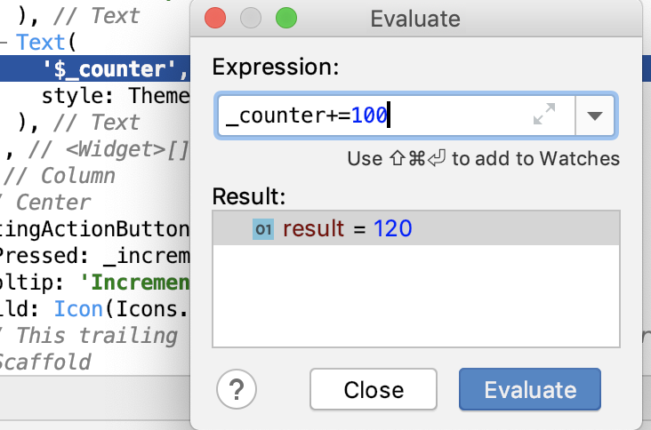 - 又比如,我们可以点击表达式计算按钮来通过赋值或表达式方式修改任意变量的值。如下图所示,我们通过输入表达式_counter+=100,将计数器更新为120: