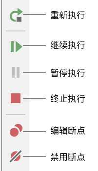 - 比如,我们可以点击继续执行按钮来让程序继续运行、点击终止执行按钮来让程序终止运行、点击重新执行按钮来让程序重新启动,或是在程序正常执行时,点击暂停执行按钮按钮来让程序暂停运行。