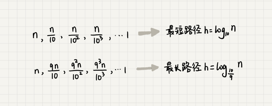 我们知道,快速排序结束的条件就是待排序的小区间,大小为$1$,也就是说叶子节点里的数据规模是$1$。从根节点$n$到叶子节点$1$,递归树中最短的一个路径每次都乘以$\frac{1}{10}$,最长的一个路径每次都乘以$\frac{9}{10}$。通过计算,我们可以得到,从根节点到叶子节点的最短路径是$\log_{10}n$,最长的路径是$\log_{\frac{10}{9}}n$。
