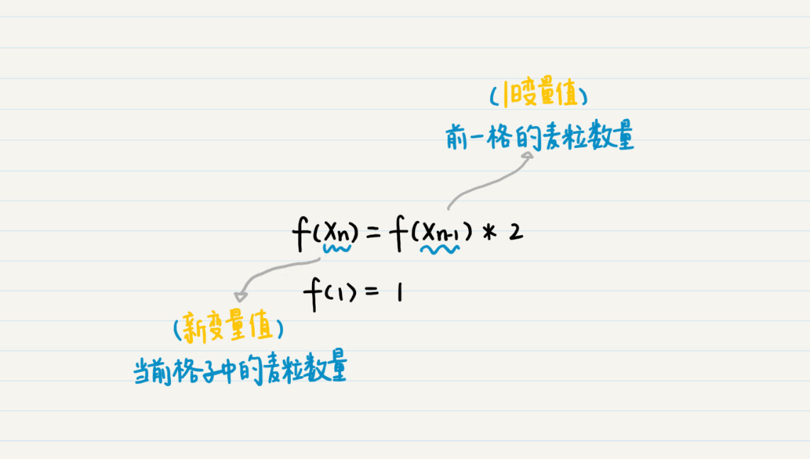 我这么说可能还是有一点抽象,不容易理解。我们还回到刚才的故事。大臣要求每一格的麦子都是前一格的两倍,那么前一格里麦子的数量就是旧的变量值,我们可以先记作$X_{n-1}$;而当前格子里麦子的数量就是新的变量值,我们记作$X_{n}$。这两个变量的递推关系就是这样的: