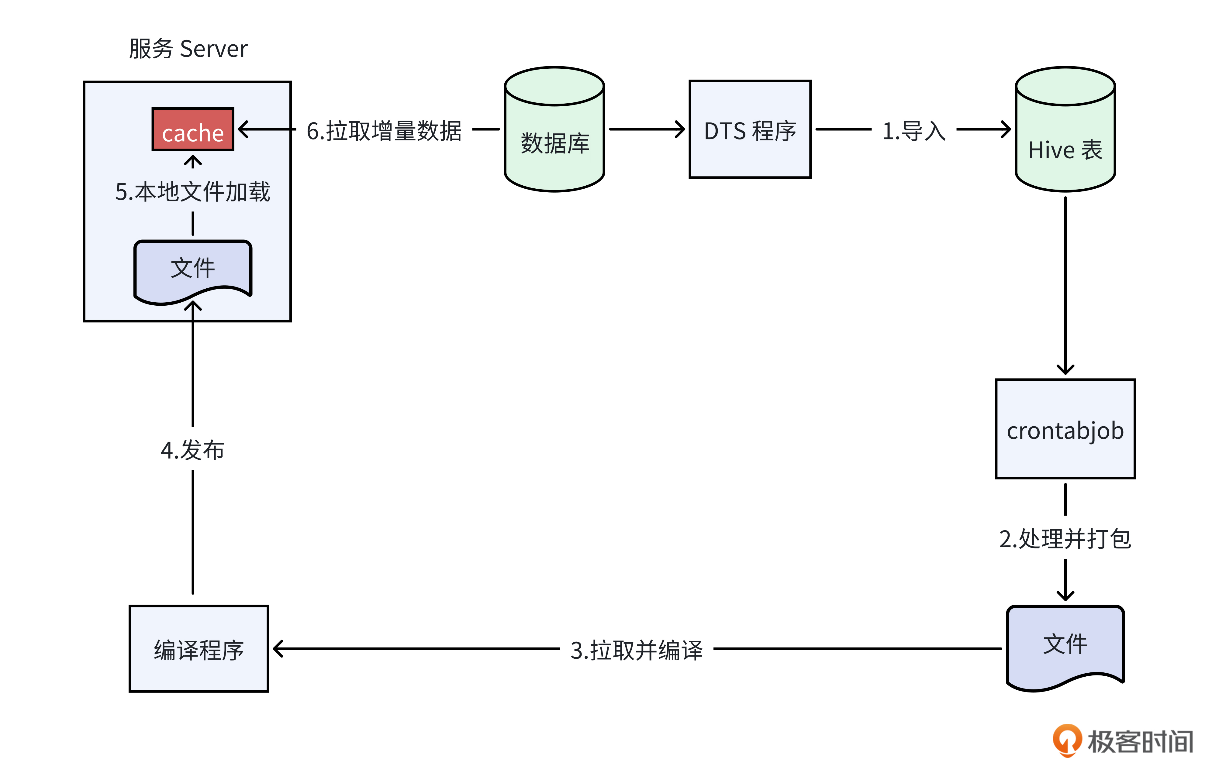 最后,在服务启动时,我们的代码应当优先从本地文件加载数据,以便快速完成绝大部分数据的加载。不过,考虑到文件生成与发布之间存在时间差,数据库中可能已经产生了新增或修改的数据。因此,我们还需要根据文件中记录的最新时间戳,从数据库中轮询拉取这个时间戳之后的所有增量数据。这样一来,由于我们只从数据库中拉取这部分增量数据,避免了全量数据从数据库拉取,就能大幅缩短服务的启动时间。