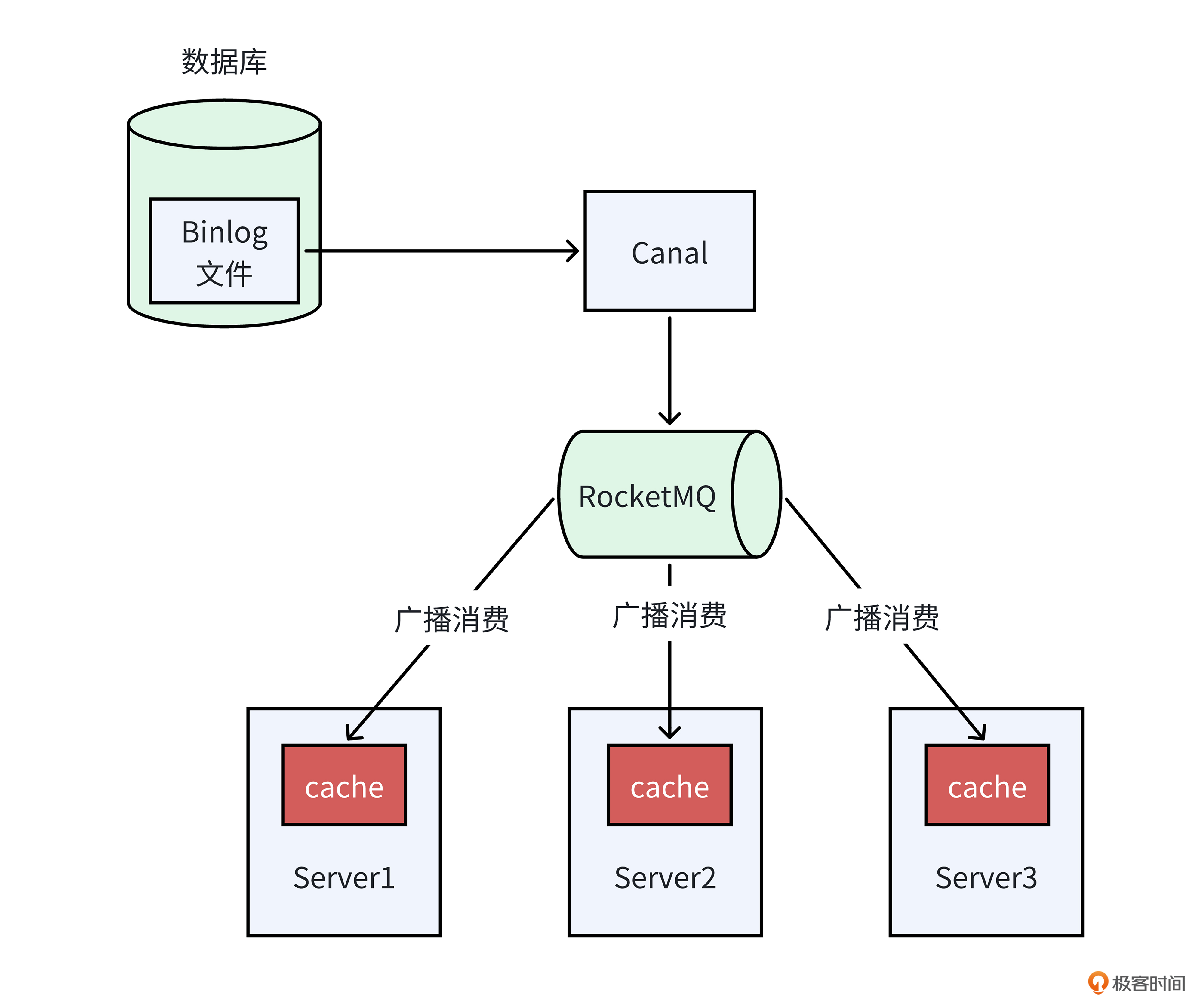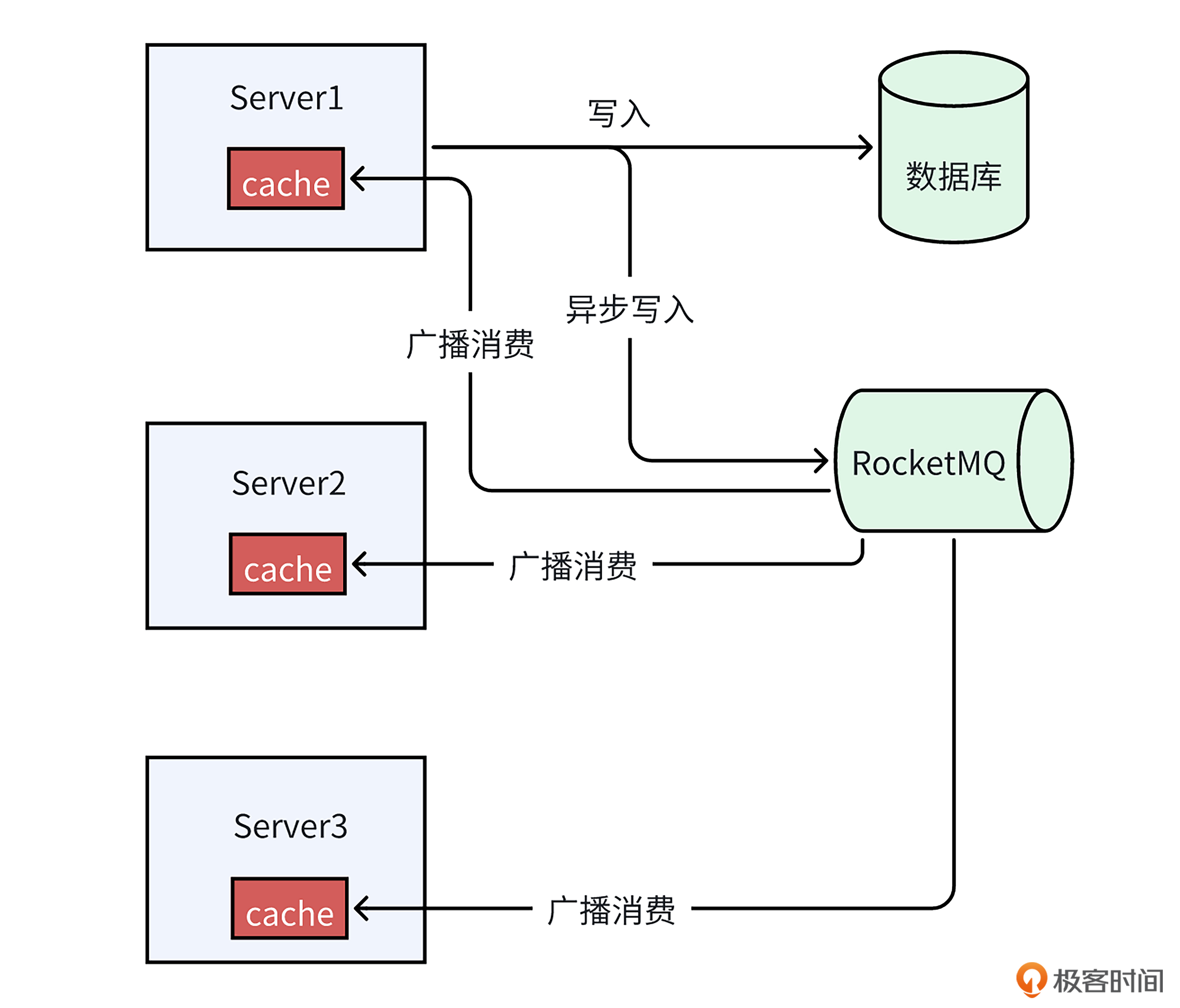 当然,使用RocketMQ广播消费的方式,虽然能够提升数据同步的实时性,但同时也可能面临数据丢失的风险,例如写入RocketMQ时失败或者RocketMQ本身出现故障。