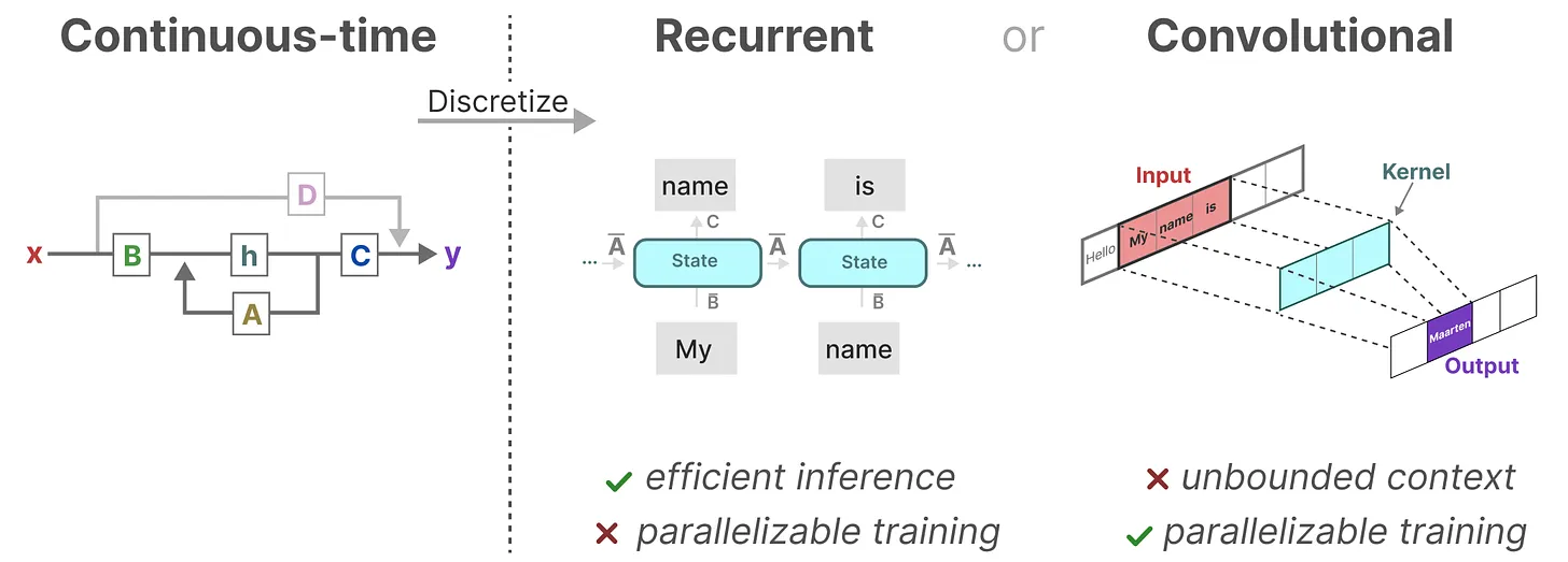 这样,将 SSM 表示为卷积,使它可以像卷积神经网络(CNN)一样进行并行训练。然而,由于内核大小固定,它们的推理速度不如 RNN 那样快。