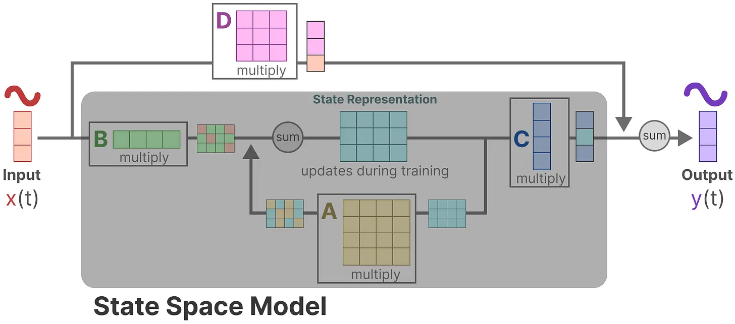 注意:矩阵A、B、C 和 D 就是我们常说的参数,它们是可学习的。